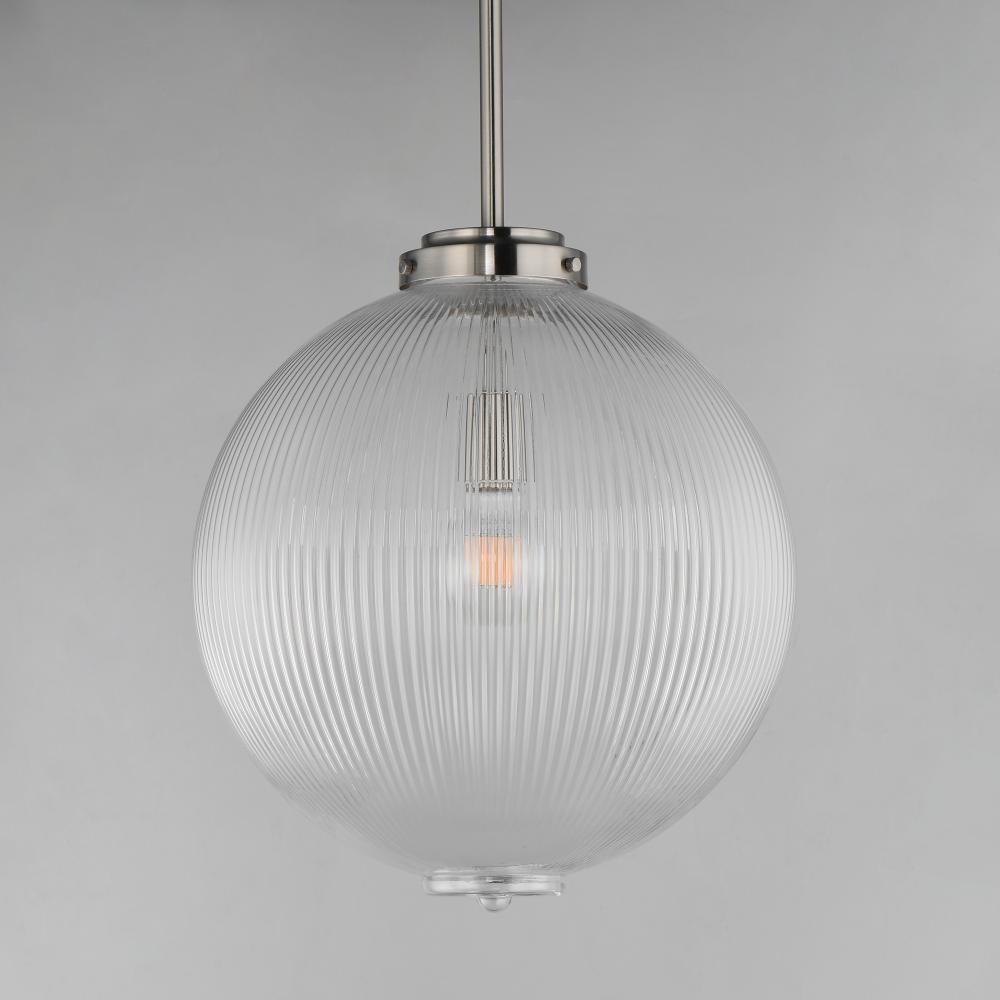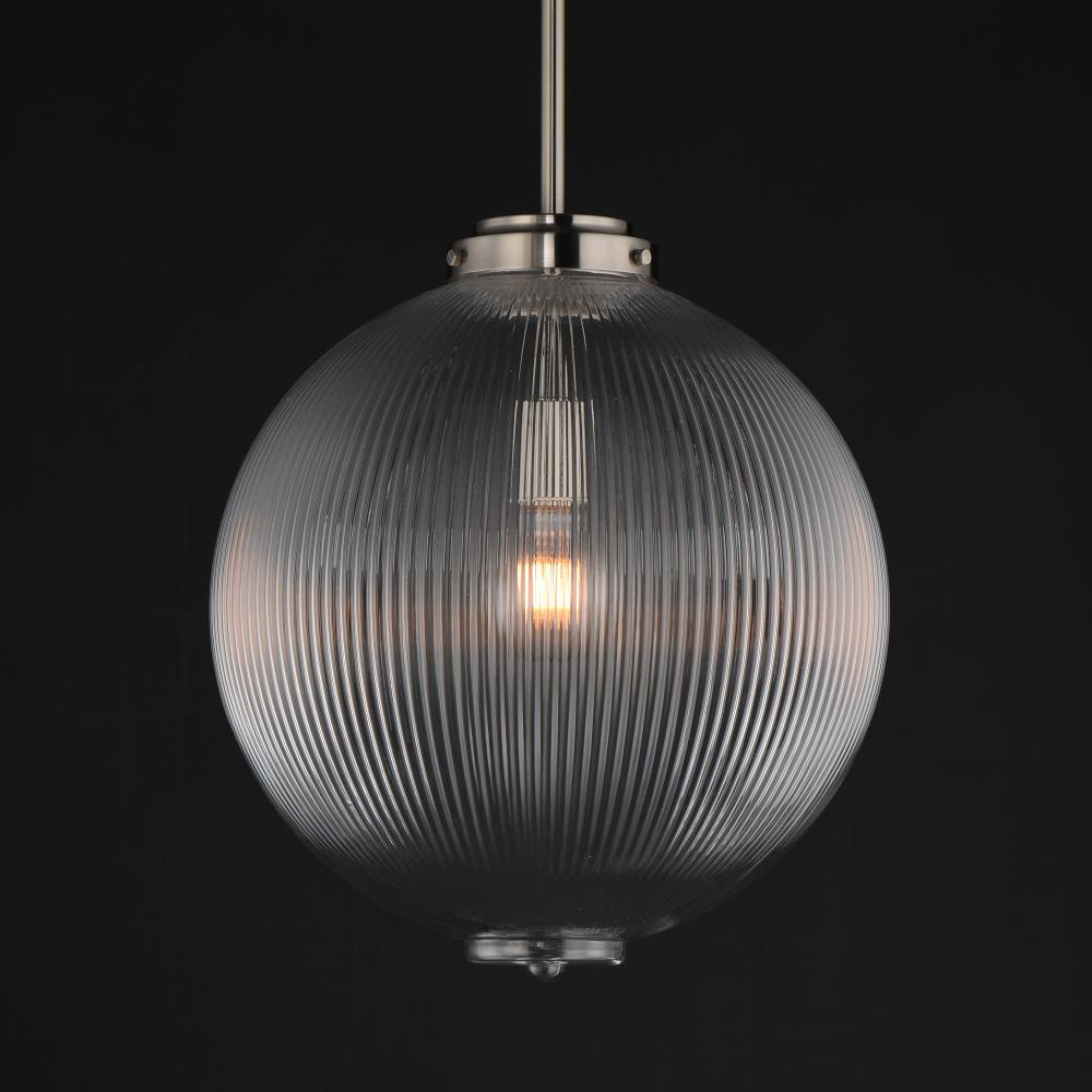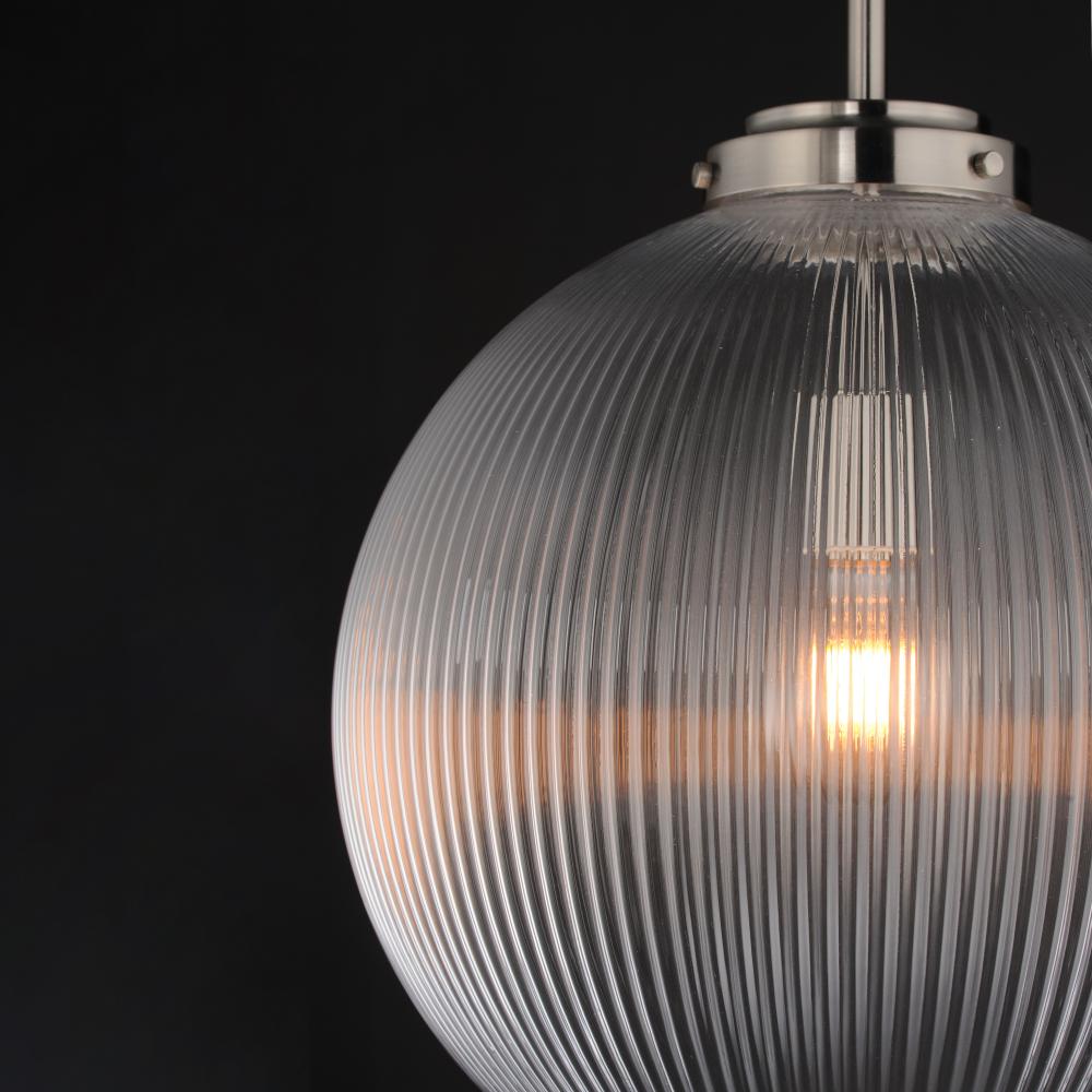Nostalgic spherical glass volumes with a ribbed pattern and a dipped flat bottom, this collection offers a retro and eclectic choice for pendants and sconces. Available in Oil Rubbed Bronze, Satin Brass, and Satin Nickel, these fixtures provide elegant ill