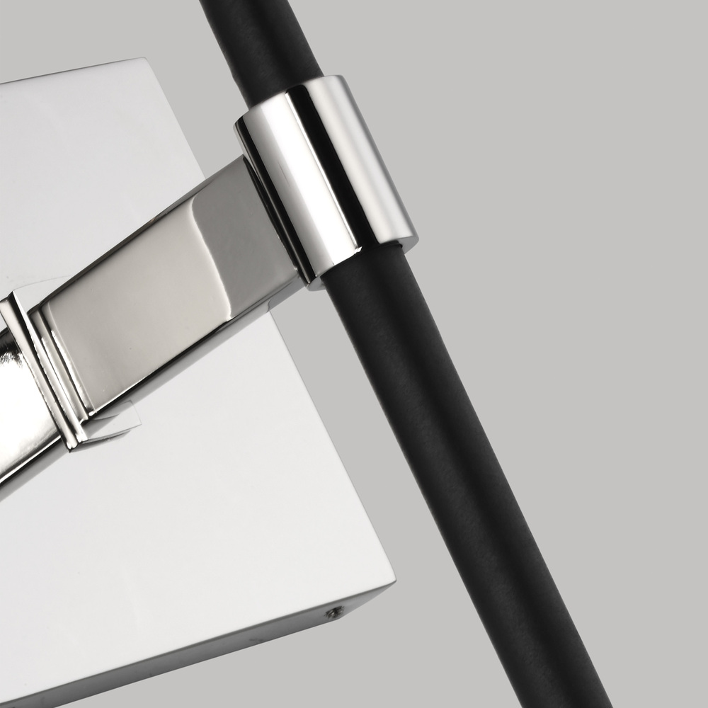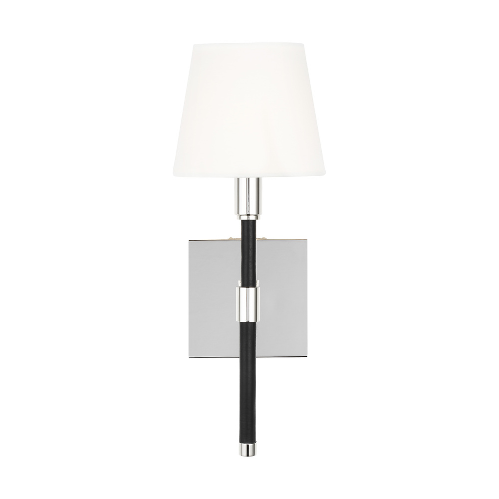 In the Katie one light wall sconce a leather stem (available in 2 lengths) contrasts with metal and white linen fabric shade to round out a timeless design. Available in: Time Worn Brass with Brown Leather or Polished Nickel with Black Leather. The combination of leather and steel gives this round chandelier equestrian flair.