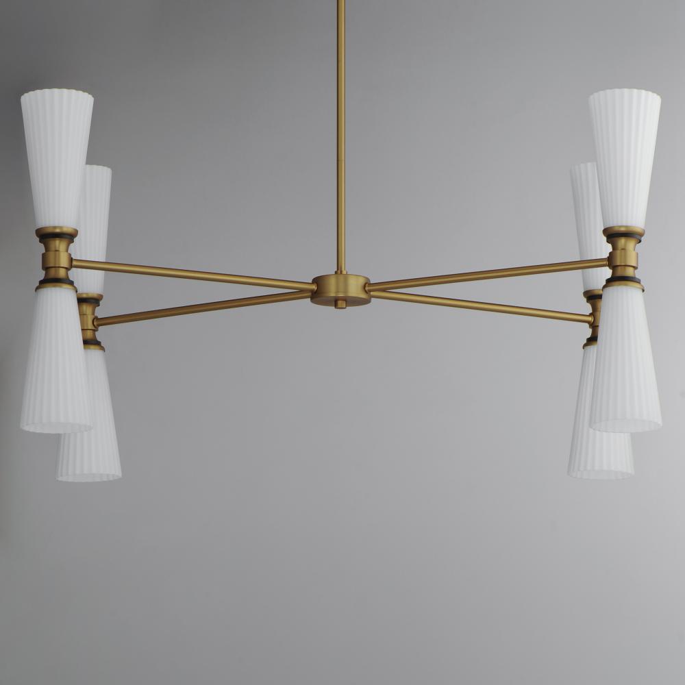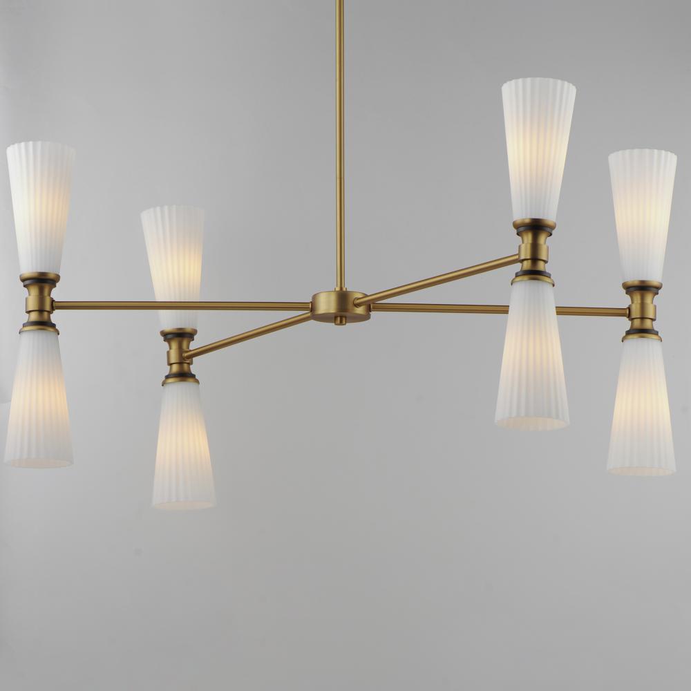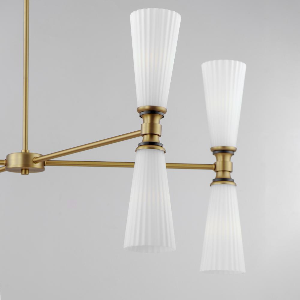 Fluted Satin White glass flares outward from an intricate and thin arm. The contrasting Natural Aged Brass and Matte Black finish adds character to the simple and stately fixtures that easily transition from modern and more traditional spaces.