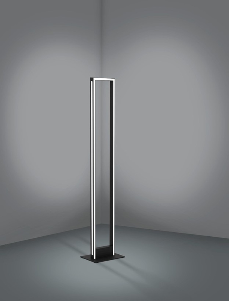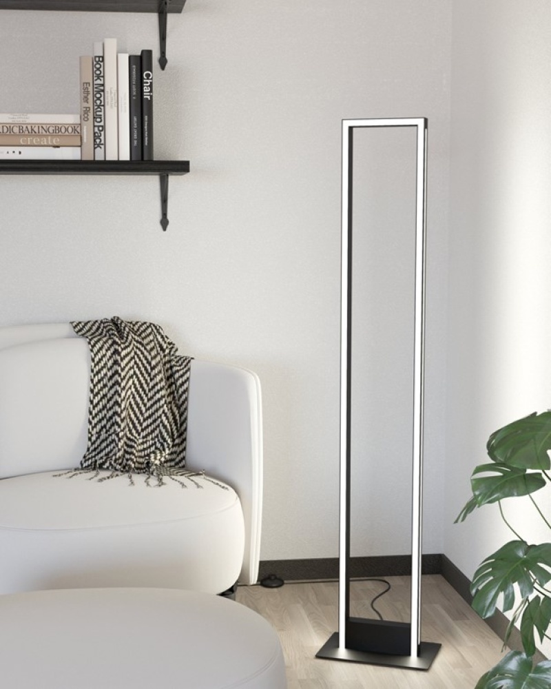 The SALVILANAS LED floor lamp features a rectangular black metal frame with integrated LED components. The innovative design ensures light is cast indirectly from the metal frame and directly into the room. The black metal base has a black cable with an in-line switch for easy operation. The LEDs behind the white plastic diffusers produce a pleasant light. Whether in the living room, bedroom or hallway, the product will create the right mood in any space.