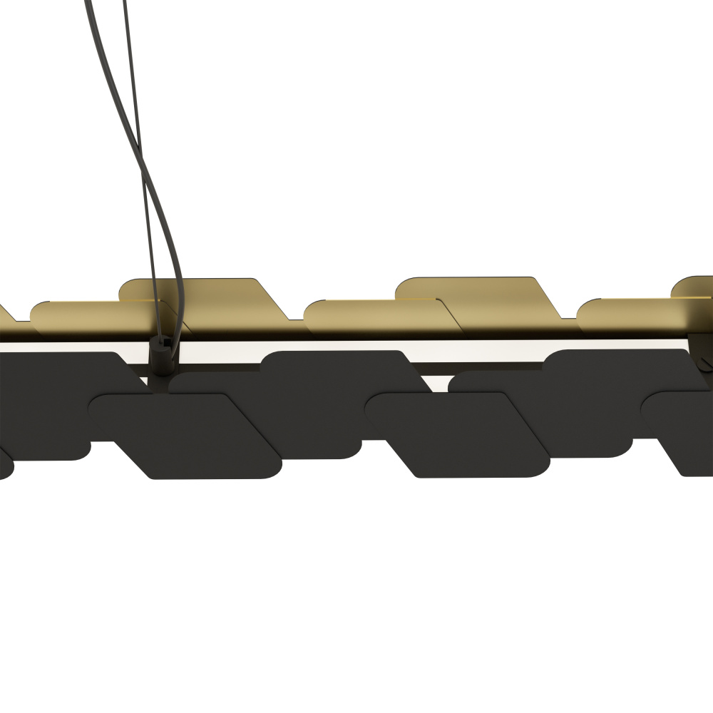 The ALTAGRACIA LED pendant features an elongated gold & black metal shade in an offset pattern. The integrated LEDs between the geometric metal shade cast a warm white light upwards and downwards. The pendant light blends with modern home living styles, creating a distinctive, eye-catching feature.