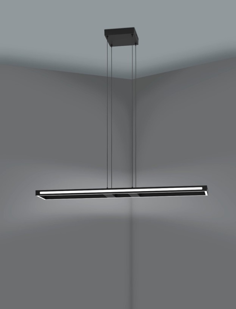 The SALVILANAS LED pendant light features a rectangular black metal frame with integrated LED components. The innovative design ensures that light is cast indirectly from the metal frame and directly down into the room. The LEDs behind the white plastic diffuser produce a pleasant light. The pendant provides a modern lighting solution to create the right mood in the living room or dining room above the dining table.