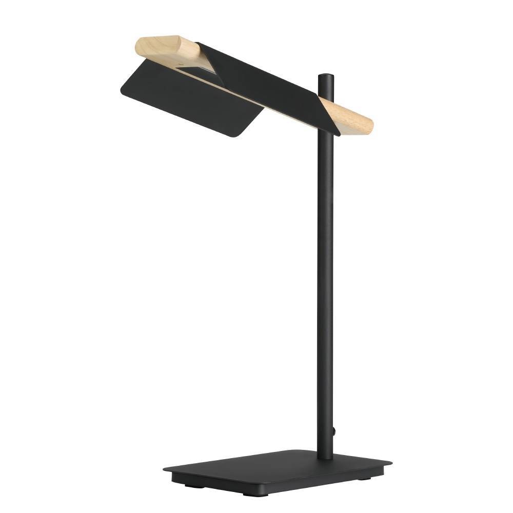 The ERMUA LED table lamp features a black metal shade overlaying natural wood giving this lamp a rustic design. This openwork fixture mixes real wood and black finish metal for a distinctive industrial look. The style is sure to become the focal point in your home.