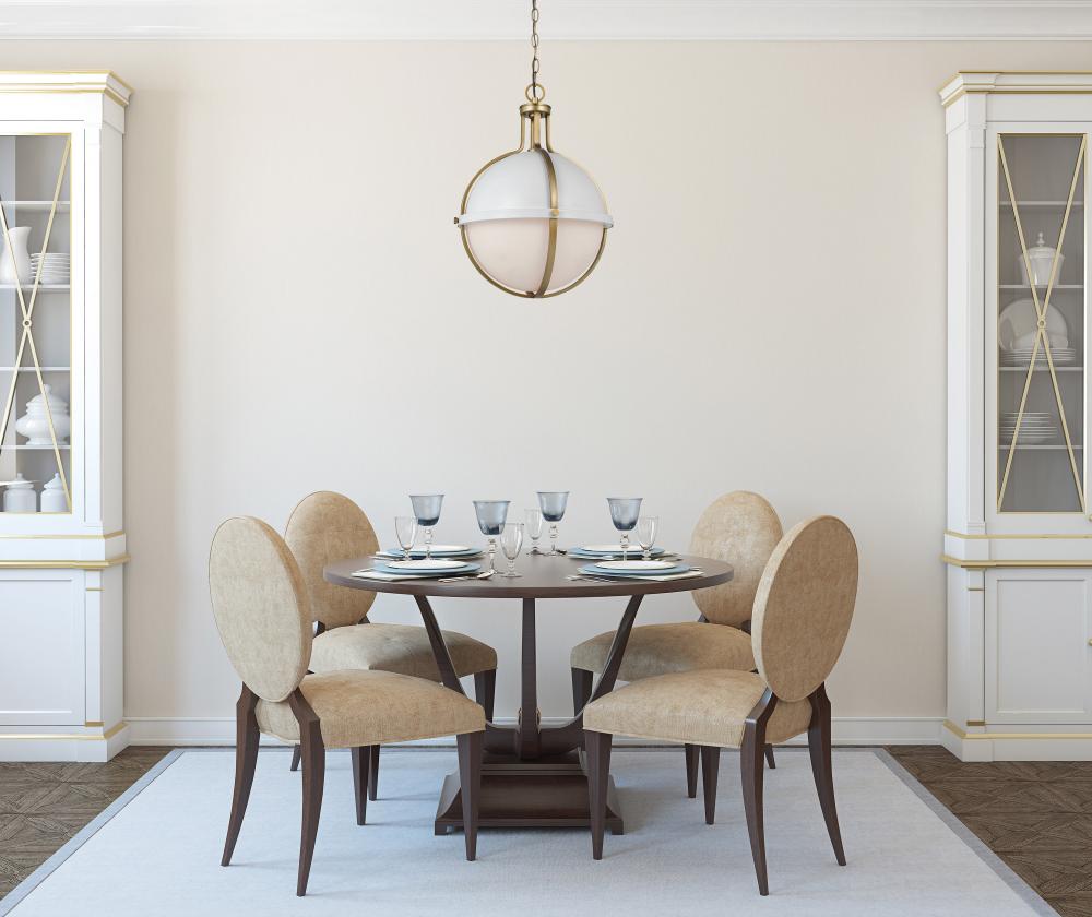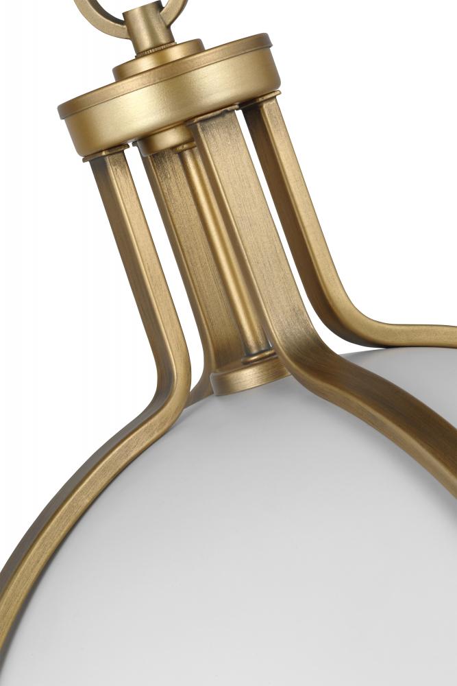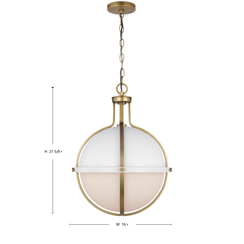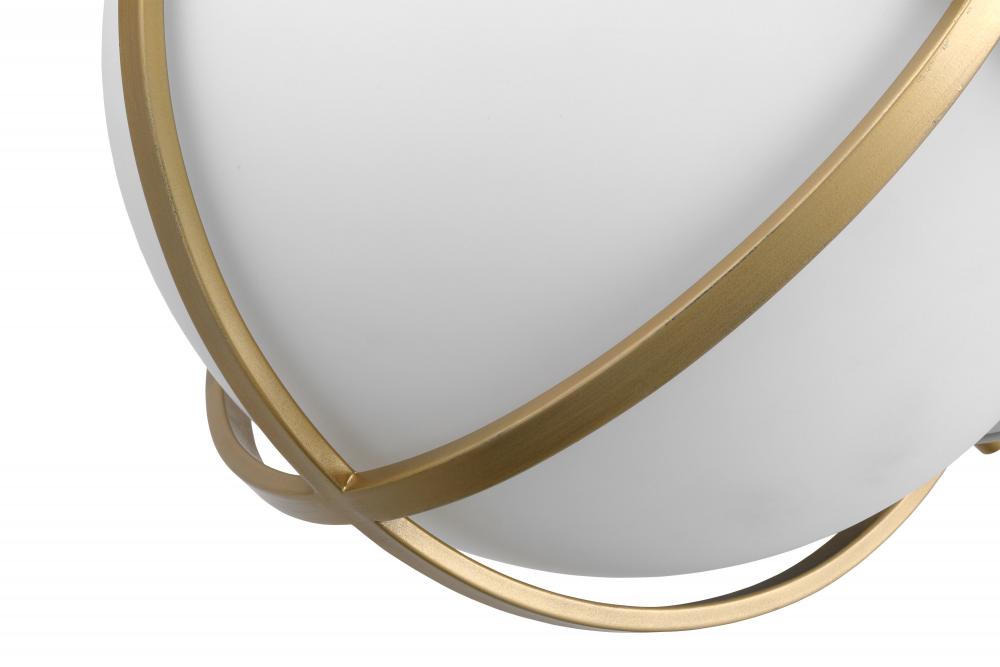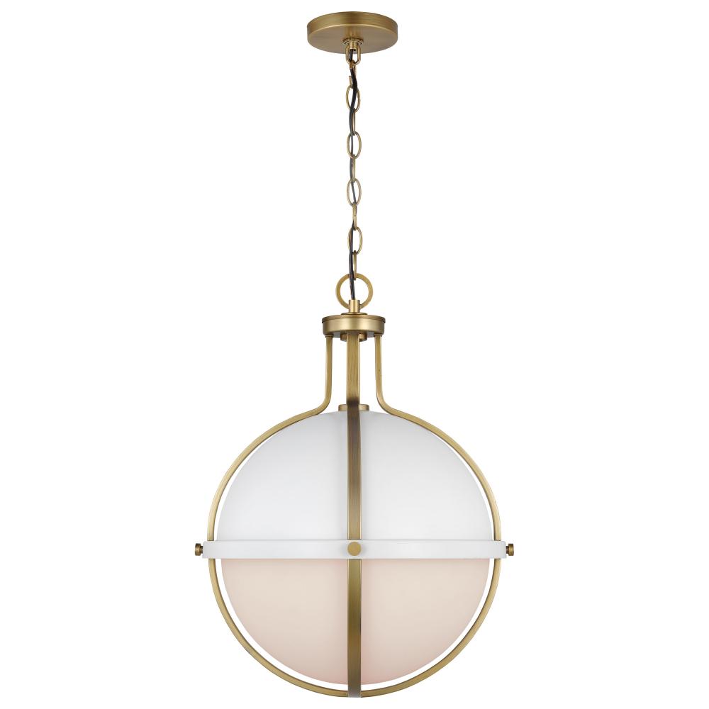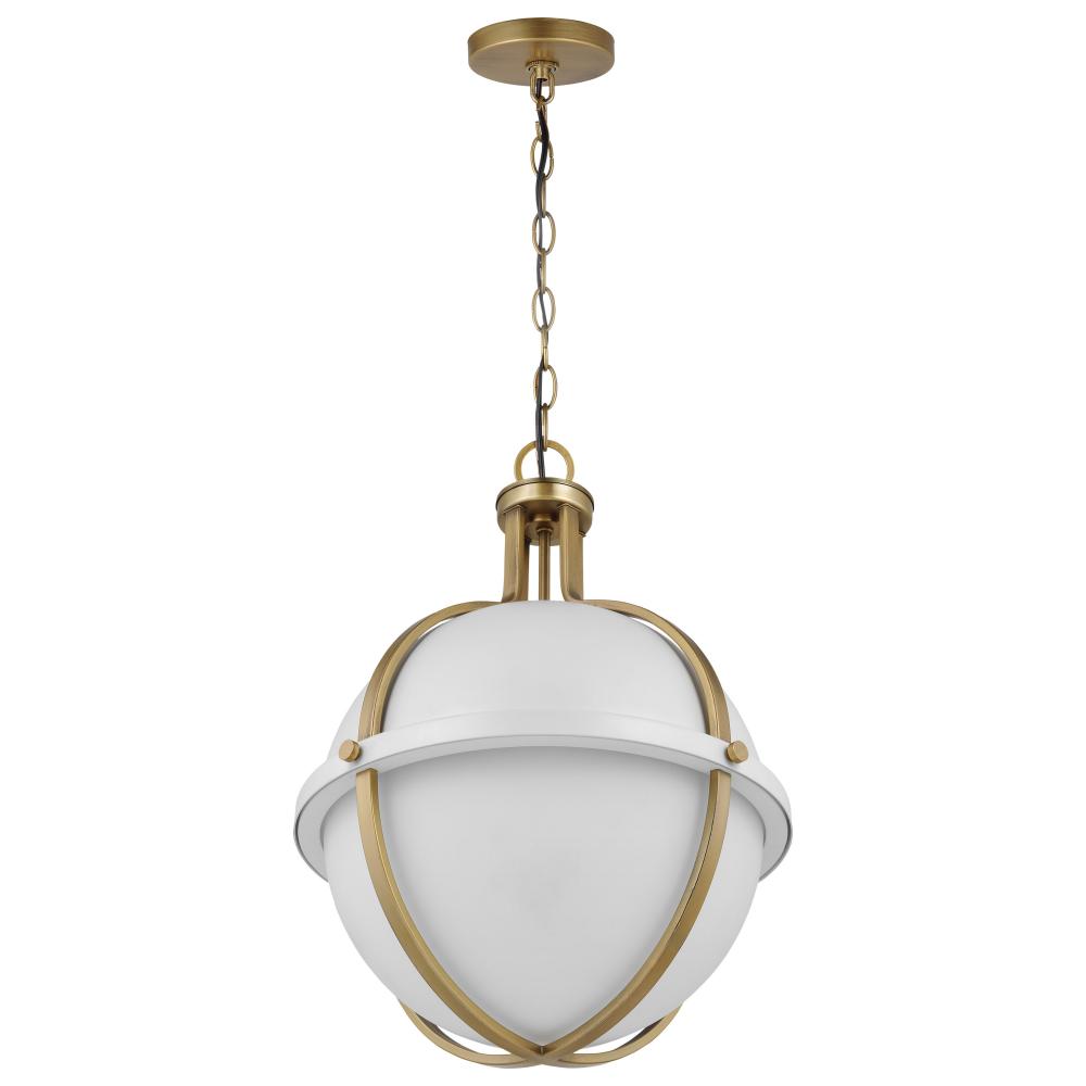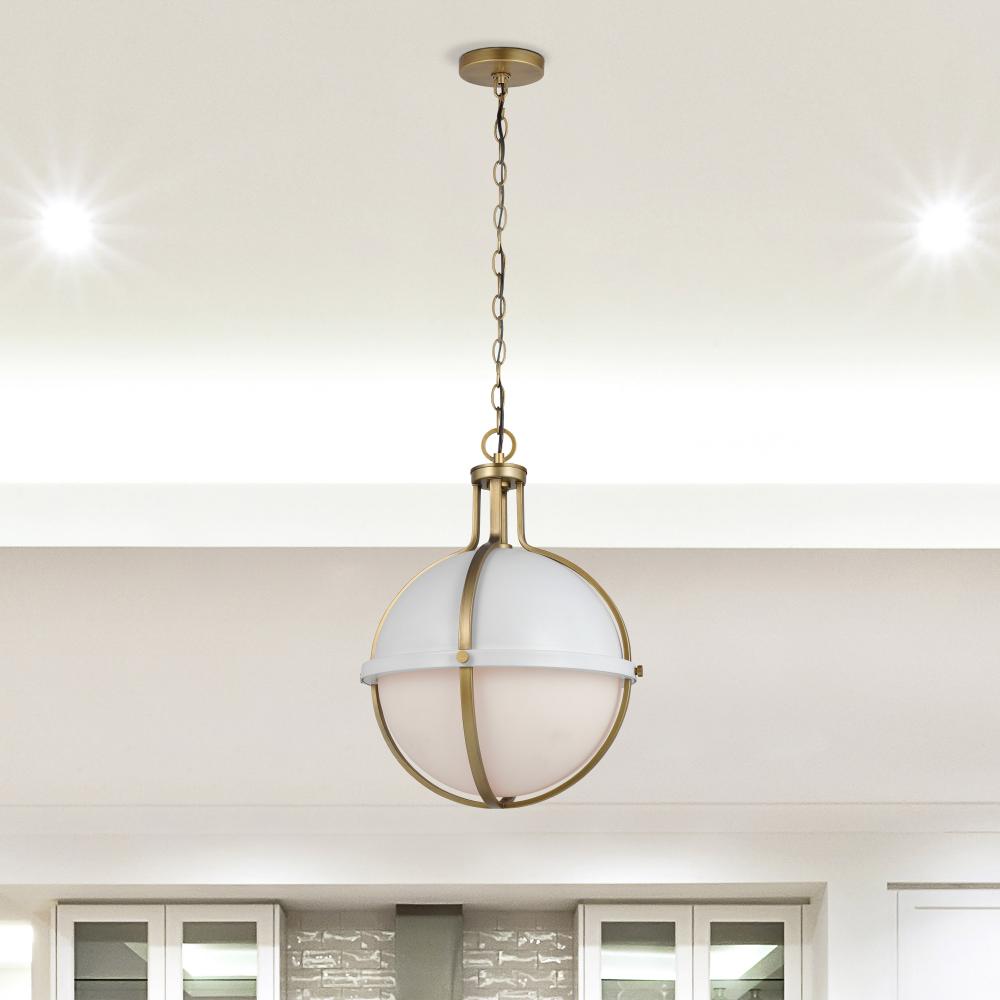 The striking Lincoln 60-7665 large pendant was inspired by an armillary sphere, consisting of a framework of elegant rings. Broad, circular bands surround the orb, and knob details in a brass hue enhance the opal glass and matte white finish for a prominen