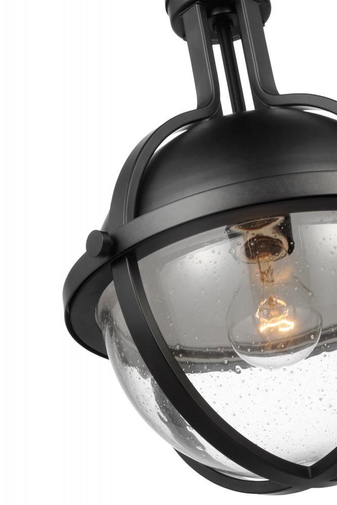 The striking Lincoln 60-7674 medium pendant was inspired by an armillary sphere, consisting of a framework of elegant rings. Broad, circular bands surround the orb, and knob details in a matte black finish enhance the clear seeded glass for a prominent, st