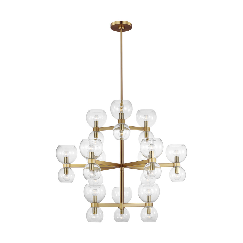 Londyn is inspired by geometric playful midcentury fixtures in metal and glass with exciting profiles and scale play. Rectangle stock metal rods and a playful layout of blown glass globes in two sizes with elegant metal cuffs create visual interest. This chandelier would be great above a dining table or casual island/nook.