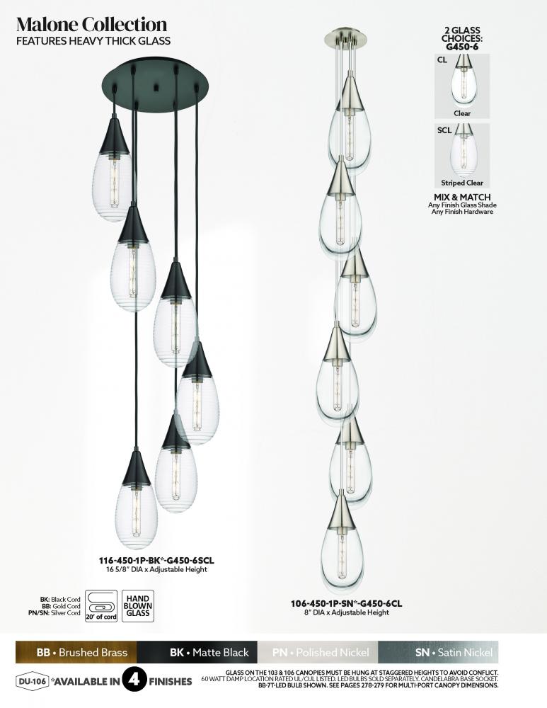 The Malone Pendant is a modern design for the traditional teardrop form. The large fixture presents a beautiful silhouette with a cone inspired metal base opening up to reveal a single bulb encased in classic drop shaped heavy glass.