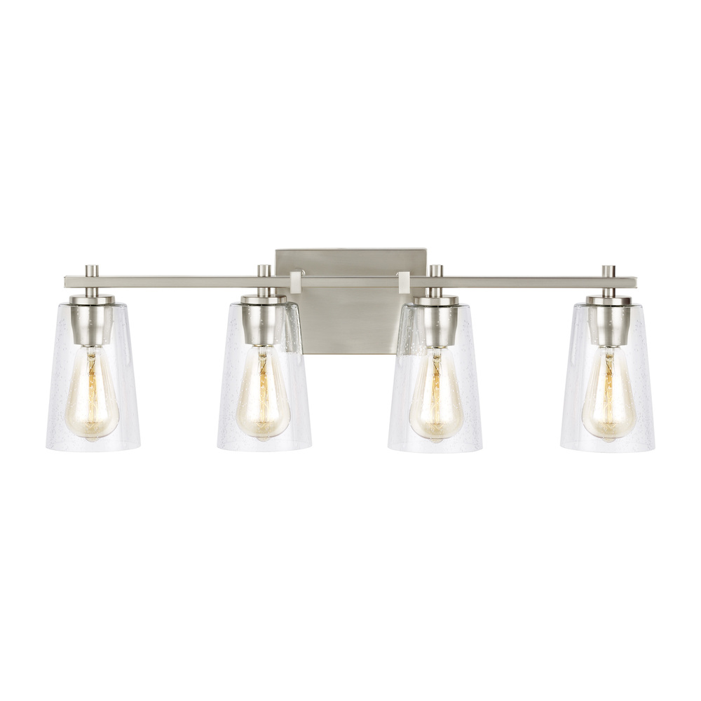 The Sean Lavin Mercer four light vanity fixture in satin nickel provides abundant light for your bath vanity, while adding a layer of today's style to your interior design. Modern details, like the clean square supports of the cross arm and sleek, rectangular backplate, are defining features of the Mercer. Choose from either refreshingly bright Chrome or warm, rustic Oil Rubbed Bronze hardware for a distinct look, both with tapered Clear Seeded glass shades that complete the tailored look.