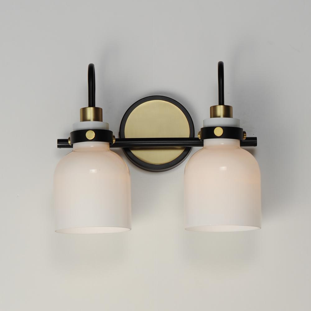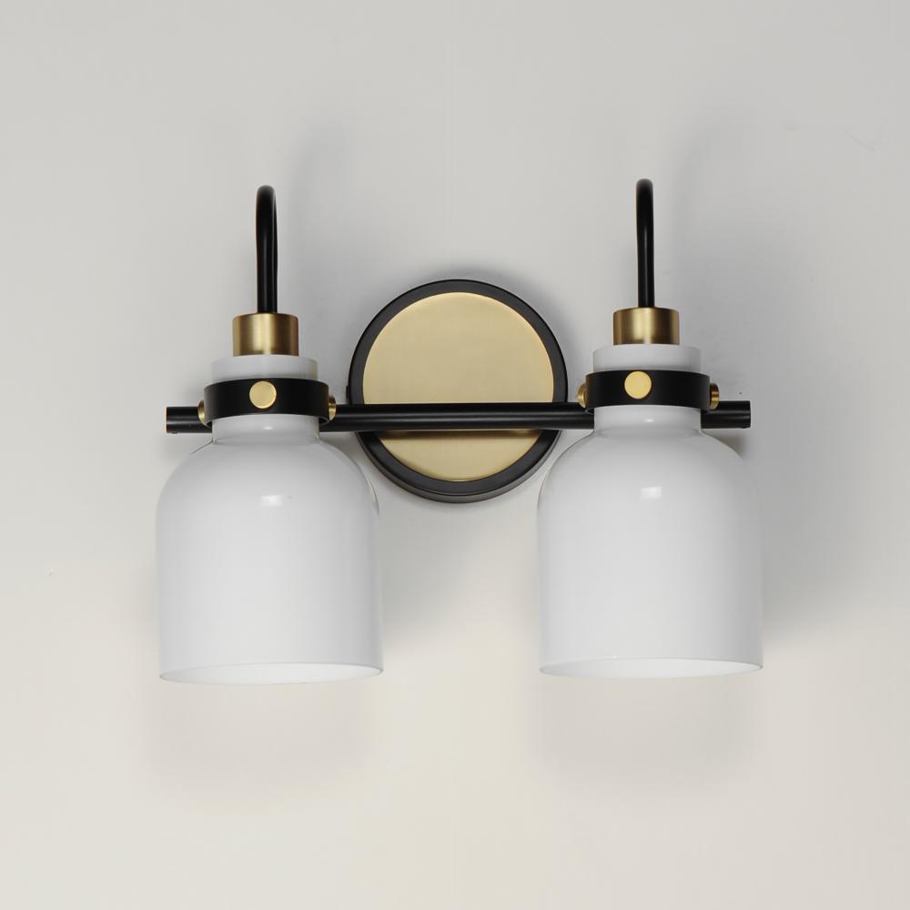 Celebrate nostalgia using these sconces that feature opal White glass shades in a bell shape. Supported on rings of metal in your choice of Polished Chrome or a bolder two-tone Black and Satin Brass, this refreshing take plays into a retro aesthetic of you