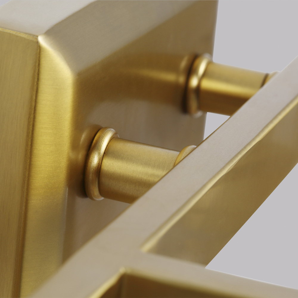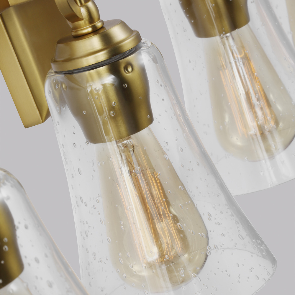 The Sean Lavin Monterro four light vanity fixture in burnished brass provides abundant light for your bath vanity, while adding a layer of today's style to your interior design. Monterro features beautiful tapered glass shades and exquisite cast details, including a cast backplate, cast ring, and hook hardware that elegantly supports the shades. The Chrome version is available with two glass options; either White Opal Etched glass or Clear Seeded glass, while the Burnished Brass, Satin Nickel finish is available in Clear Seeded glass only.