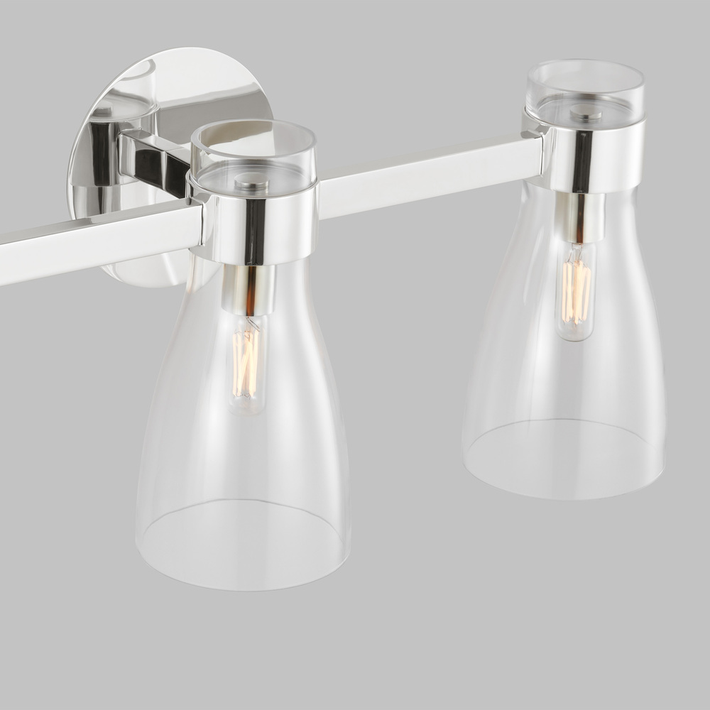 This stylish Moritz sconce by AERIN for Visual Comfort Studio Collection includes glass shades originally inspired by the form of classic task lamps, giving it a contemporary twist. A good choice for spaces that require abundant lightings, such as above a vanity or bathroom mirror.