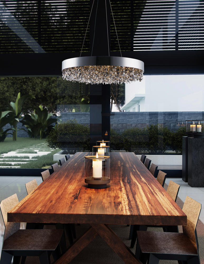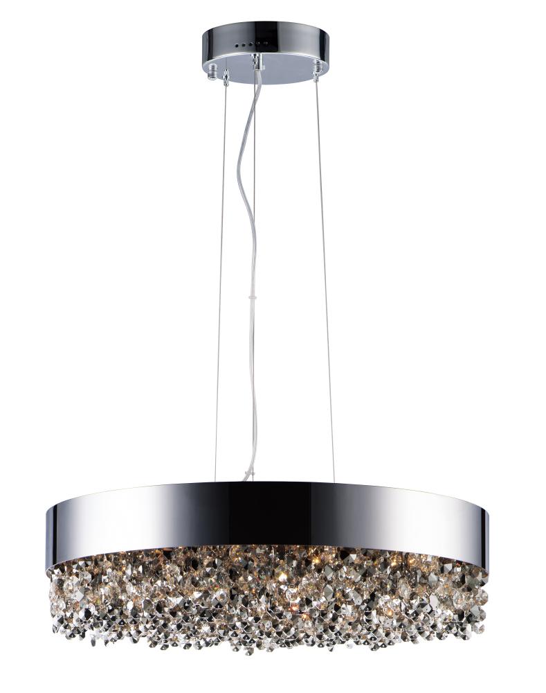 A sea of crystal strands suspend from within drums of steel which are finished in your choice of Bronze with Scotch crystal or Polished Chrome with Mirror Smoke crystal. Hidden inside the drum is a powerful dimmable LED source which has the crystals dancin