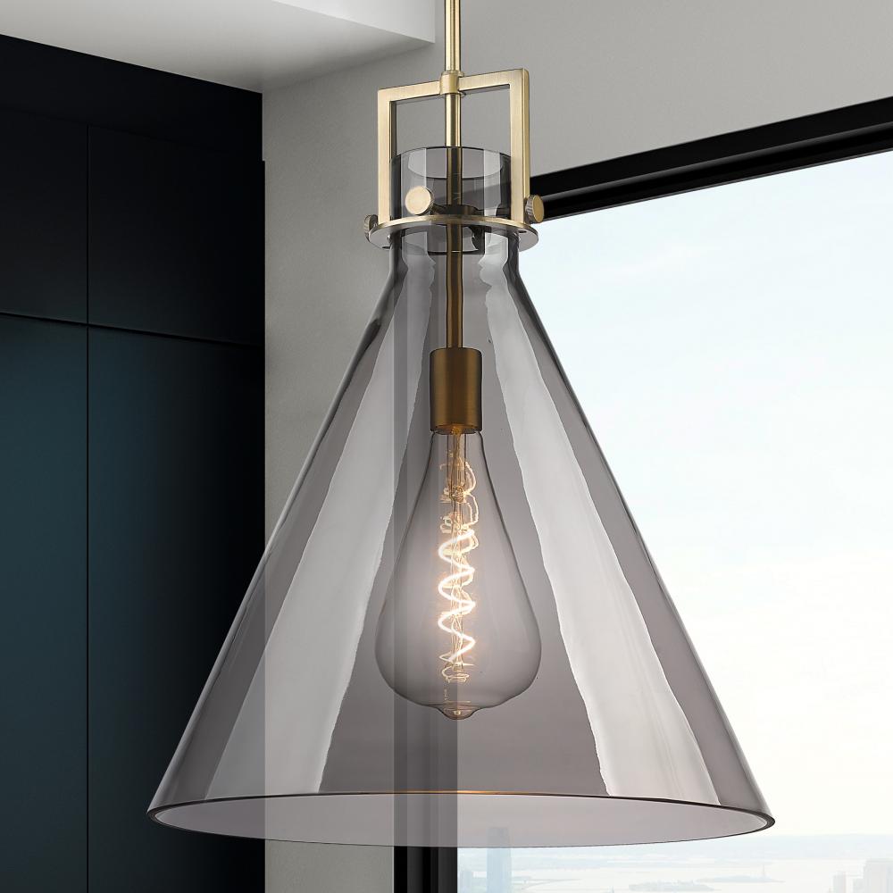 Newton Cone - 1 Light - 18 inch - Brushed Brass - Light Smoke Shade - Stem hung - Pendant