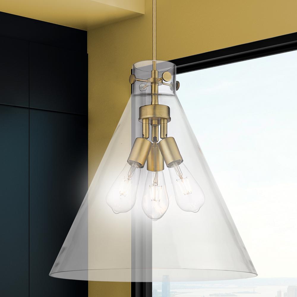 Newton Cone - 3 Light - 18 inch - Brushed Brass - Clear Shade - Cord hung - Pendant