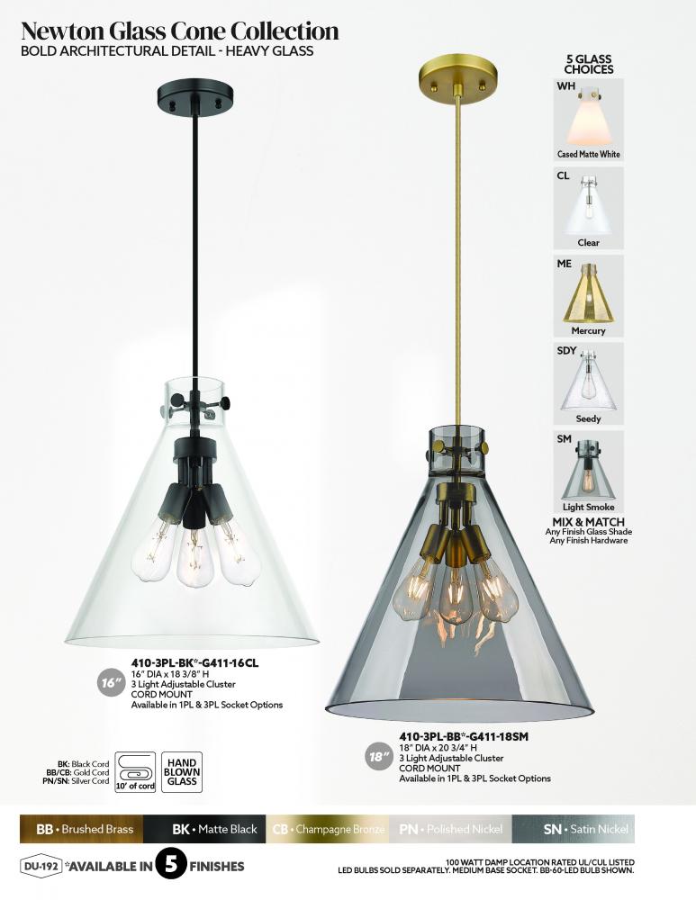 The Newton Cone is a modern industrial collection that incorporates exceptional architectural details and an equally striking cone shaped shade. The geometric shape of the glass or metal shade give this collection a charming and timeless presence. For a ki