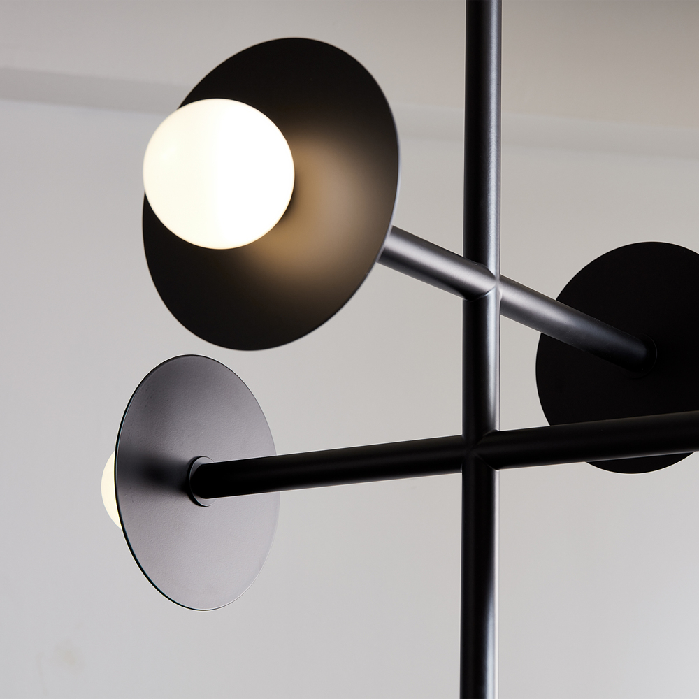 The Nodes five light linear chandelier by Kelly Wearstler supplies ample lighting for your daily needs, while adding a layer of today's style to your home's décor. Nodes task, ceiling and wall lighting is minimal yet bold, highlighting Kelly's distinctive juxtaposition of mixed-materiality and curvilinear form. Light radiates from milk glass globes set against metal discs. All fixtures can be used or without the discs. The cast canopy is available in Burnished Brass or Midnight Black. Hanging fixtures within this family feature black fabric cords, while pivot sconces can be cord and plug or hard wire.