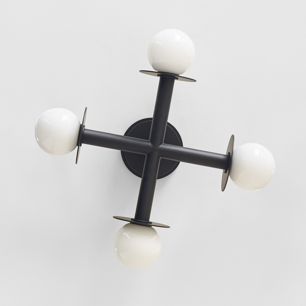 Nodes task, ceiling and wall lighting is minimal yet bold, highlighting Kelly's distinctive juxtaposition of mixed-materiality and curvilinear form. Light radiates from milk glass globes set against metal discs. All fixtures can be used or without the discs. The cast canopy is available in Burnished Brass or Midnight Black. Hanging fixtures within this family feature black fabric cords, while pivot sconces can be cord and plug or hard wire.
