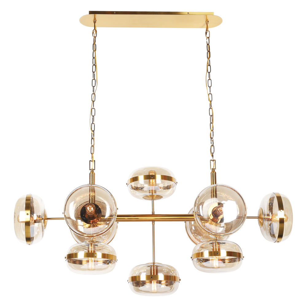 A brass band encircles cognac glass orbs that beautifully enhance the warm glow from the vintage lights within