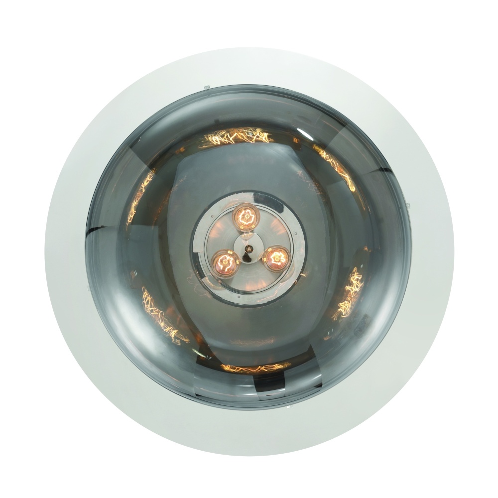 A band encircles each glass orb that beautifully reflects a warm glow from the vintage lights within. The metal support creates an inviting counterpoint to the austere design