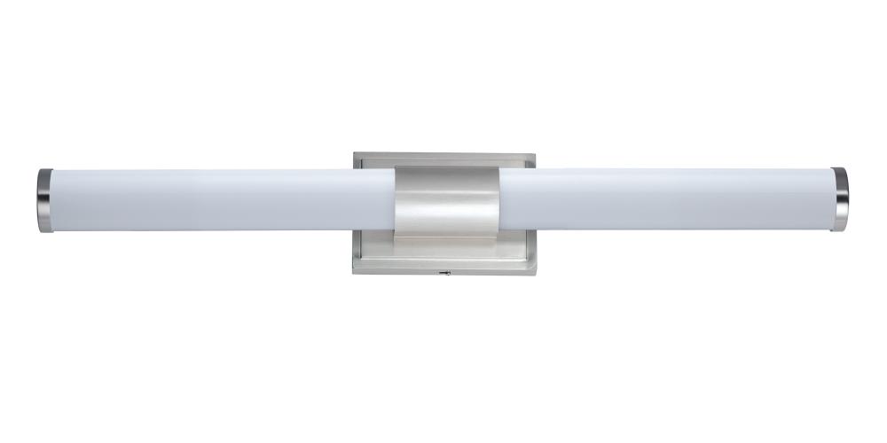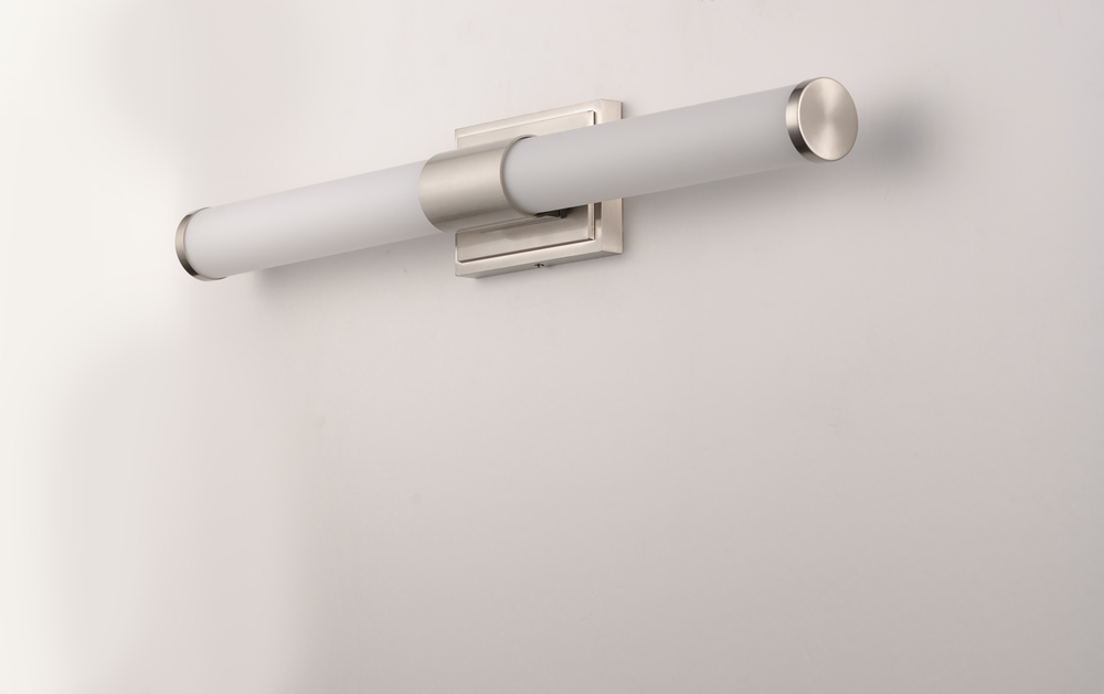 Cylinders of White cased glass are mounted onto a cast aluminum frame of Satin Nickel or Polished Chrome. LED modules evenly illuminate and provide soft yet ample illumination. Multi volt input is standard which allows for installation into commercial appl