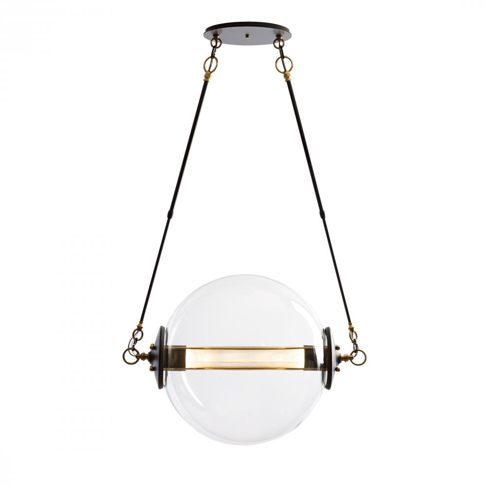 The large, blown-glass sphere's adjustable rods make it possible to position the lighting element at the desired angle. This lighting element is encased in a frosted inner tube. A stainless steel mesh tube is available for a more industrial look.