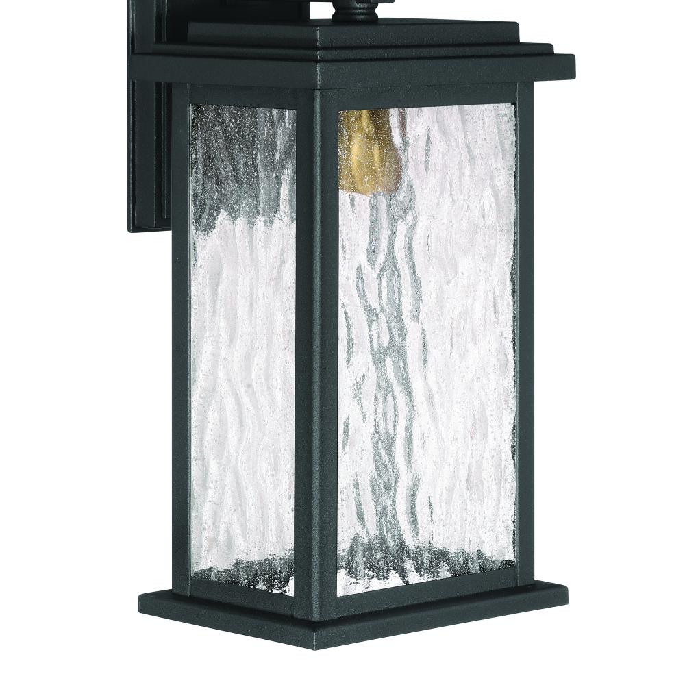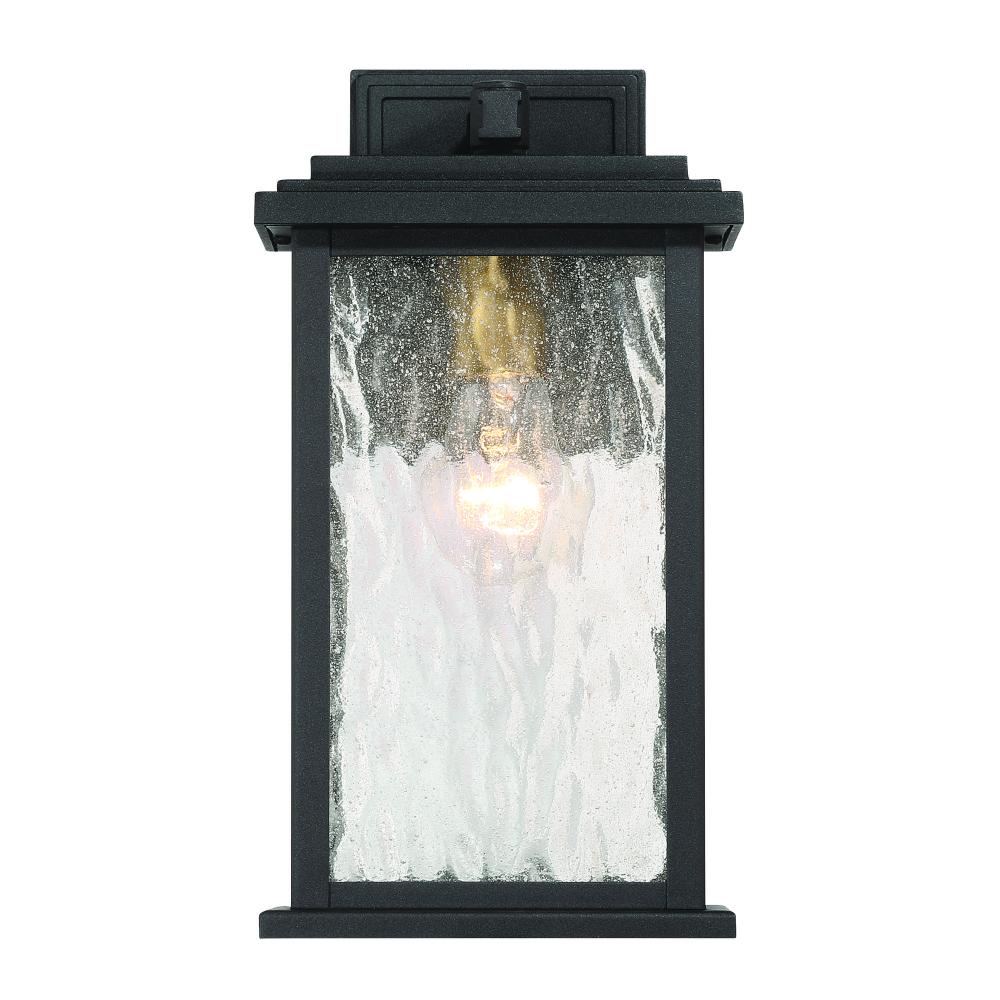 The “Estate” Collection outdoor wall sconce radiates classic allure, with its black metal frame offering a striking contrast to the mesmerizing water glass panels. Encased within, vintage brass candle covers and intricate metalwork glow warmly, evoking a sense of nostalgic charm. Perfect for enhancing any outdoor space, this sconce blends classic sophistication with modern durability.