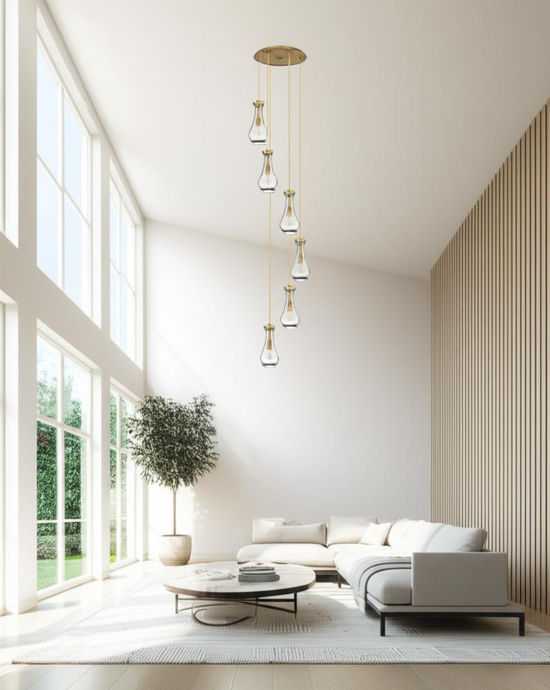 Each pendant comes with a 10-foot cord that can be trimmed to any desired length. This allows you to hang the shades at either the same height or different staggered heights.