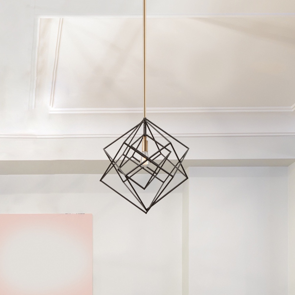 Stunning in design, this two tone multiple square chandelier from the "Artistry" collection is an instant classic. The interior has a satin brass frame, while the exterior frame is a matte black finish. Multiple rods included with hangstraight for sloped ceilings. (Larger sizes available)