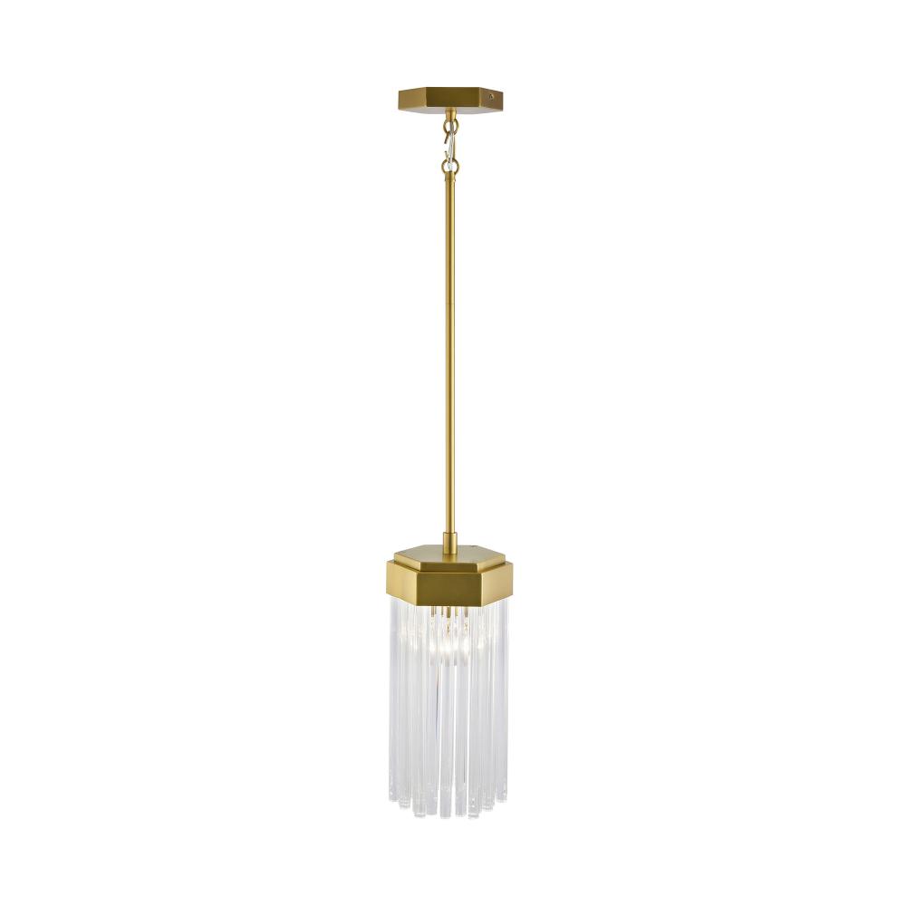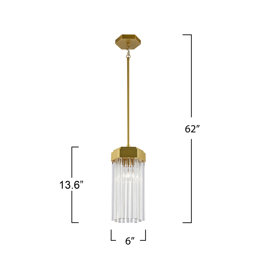The small pendant from the Emma collection by designer Kevin Kraemer is a captivating blend of elegance and geometry. Individual glass rods, delicately suspended from a brushed brass hexagonal frame, shimmer with timeless sophistication, creating a mesmerizing interplay of light. Complemented by a matching hexagonal canopy, this design brings an air of modern luxury to any space.