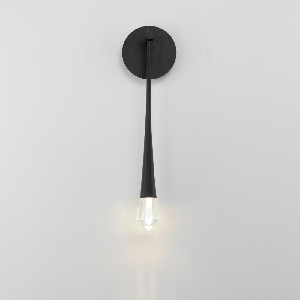 An elongated profile with piercing statement, this series of pendants feature thin black wires that support a tapered metal pendant. Recessed in this form is a high powered LED that illuminates a brilliantly faceted crystal element with etched details insi