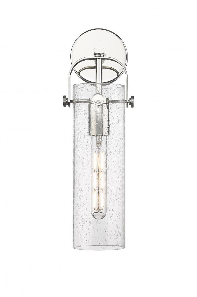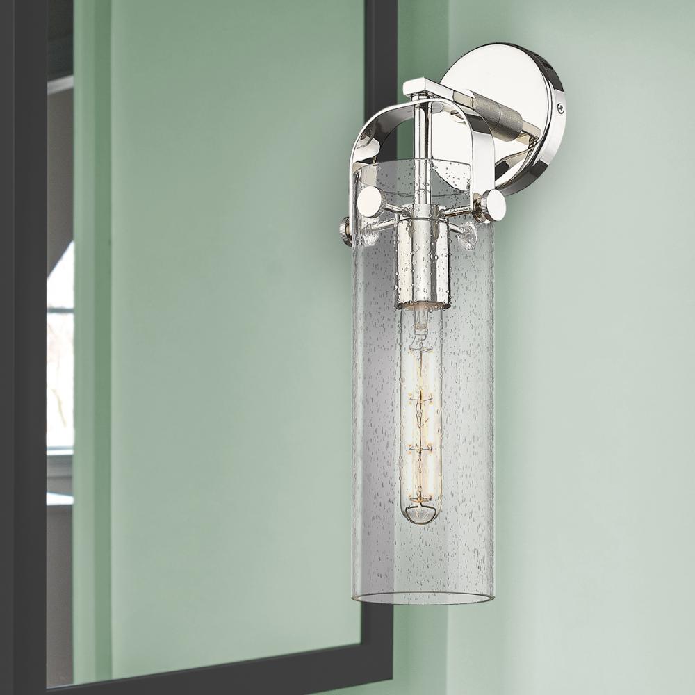 An elegant twist on industrial lighting, Pilaster boasts a metal frame with dramatic glass cylinders that are accentuated by machined metal fasteners. These fixtures are available with or without metal band detail in a complementary finish.