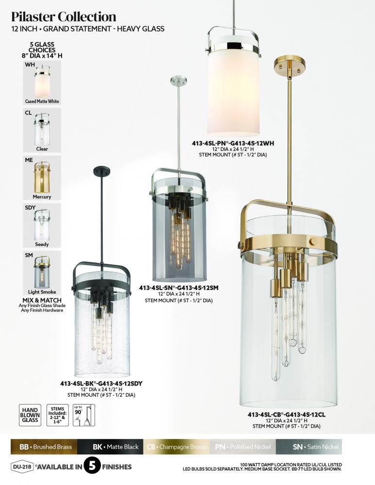 Pilaster - 4 Light - 12 inch glass - Matte Black - Clear Shade - Stem hung - Pendant
