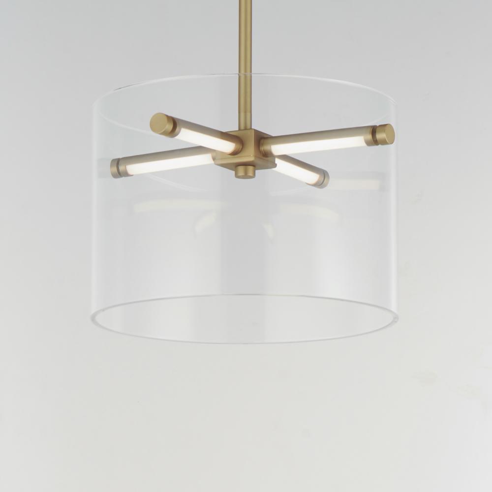 Modern, Clear glass cylinders suspended by streamlined pole structures that brightly illuminate surfaces below with high powered integrated LED. Select from two finishes, Black or Gold, and two sizes of pendants, 9 or 12.5 inch diameters, as well as a coor