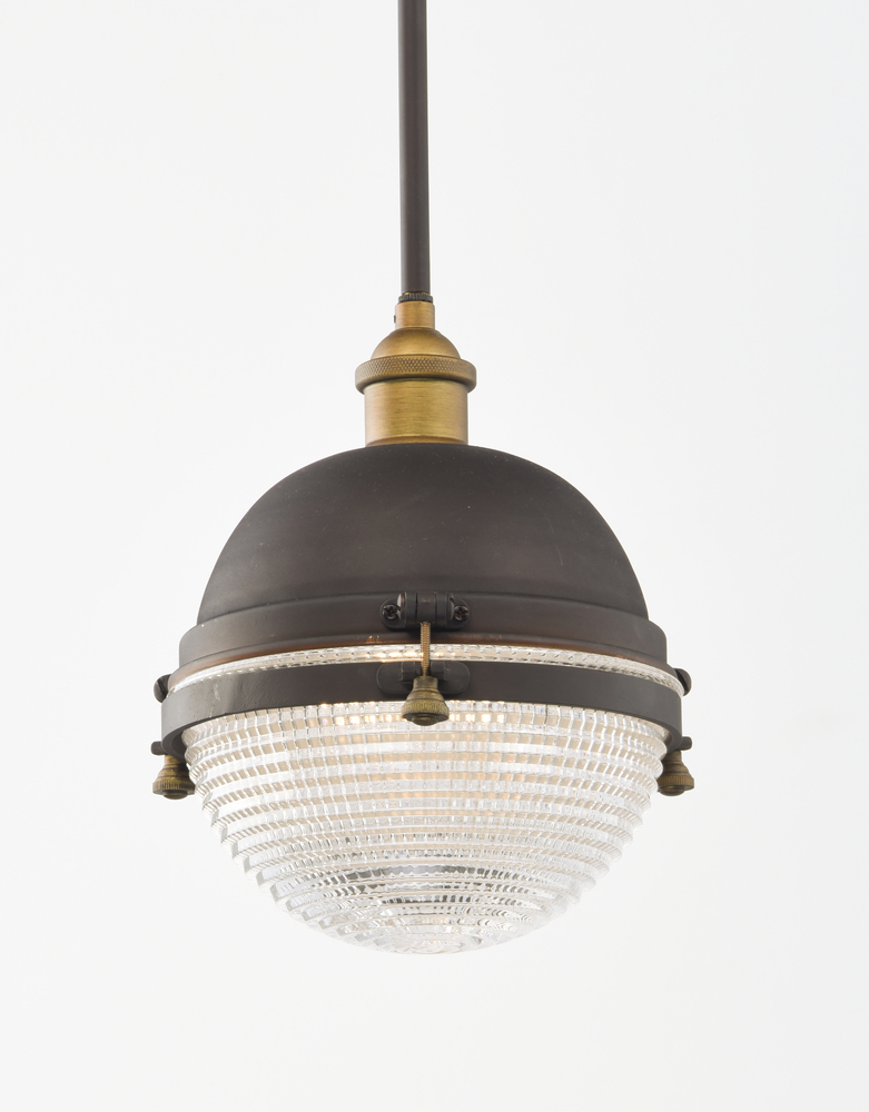 This nautical design features a solid dome of aluminum finished in Oil Rubbed Bronze with solid brass hardware finished in Antique Brass. The Clear prismatic glass diffuser completes the authentic look of this outdoor collection.