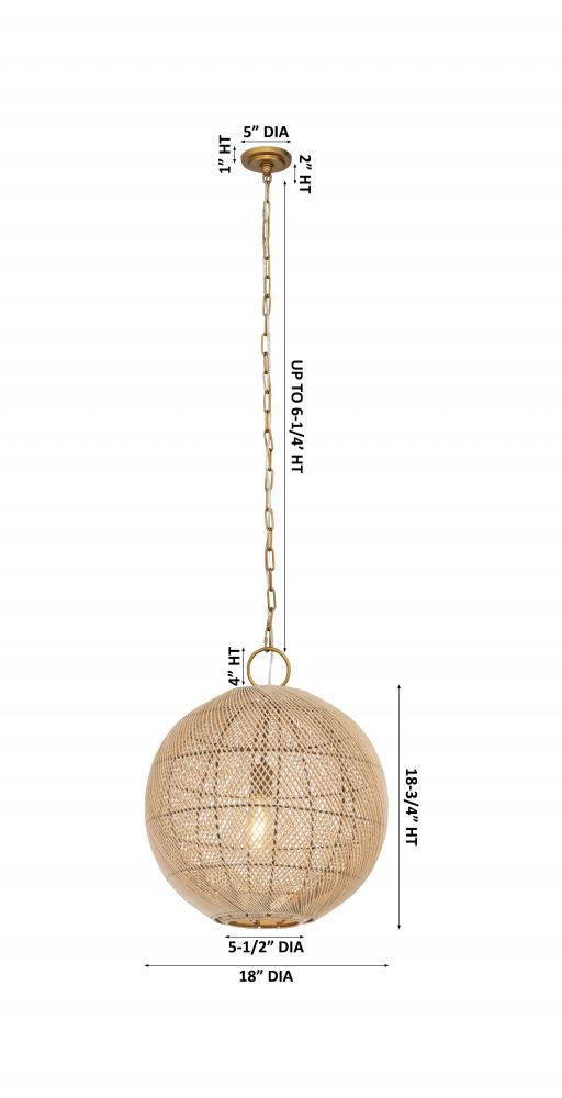 Globe shaped open weave rattan pendant with bueatufil wire detailing. This pendant is hung from wire loop and complementary chain.