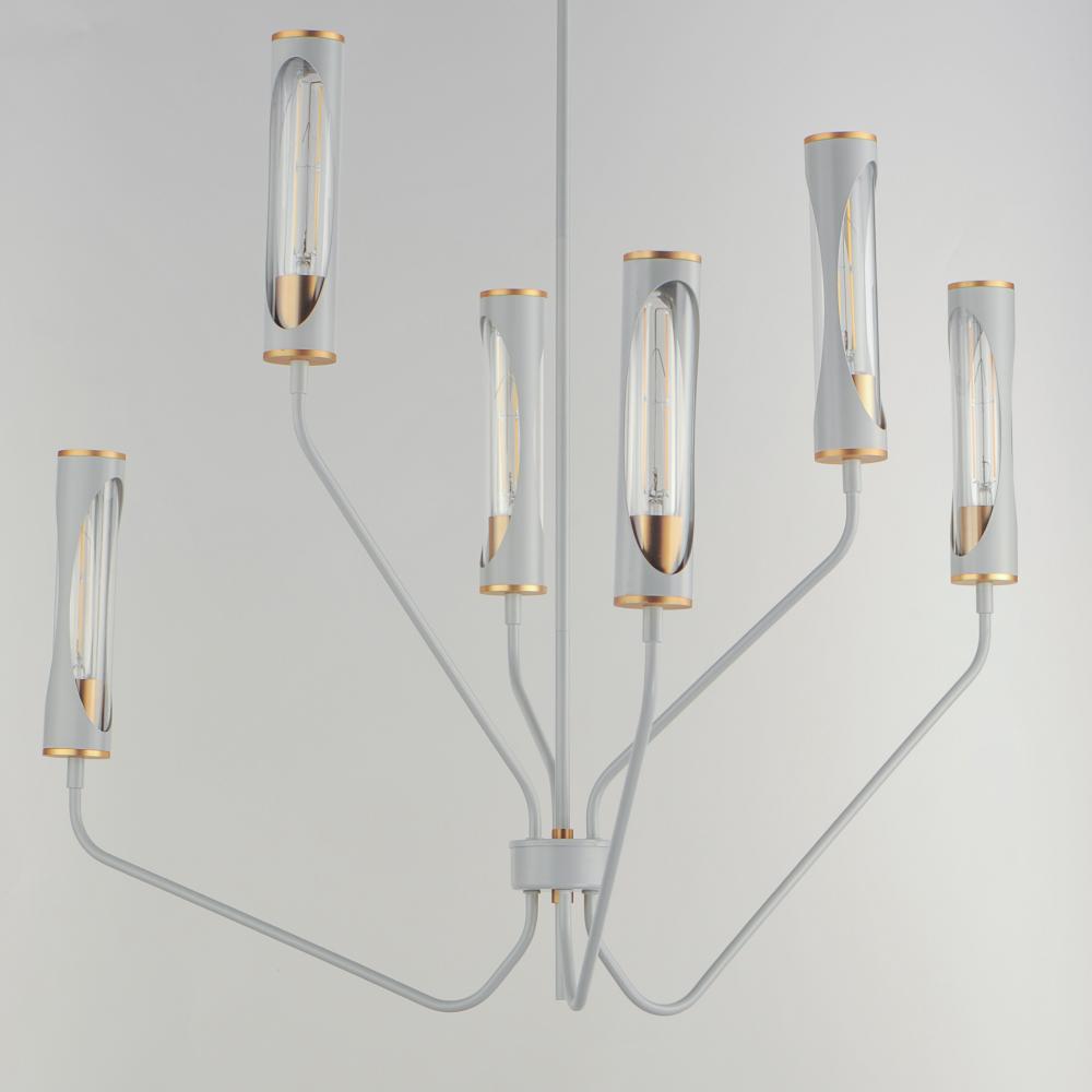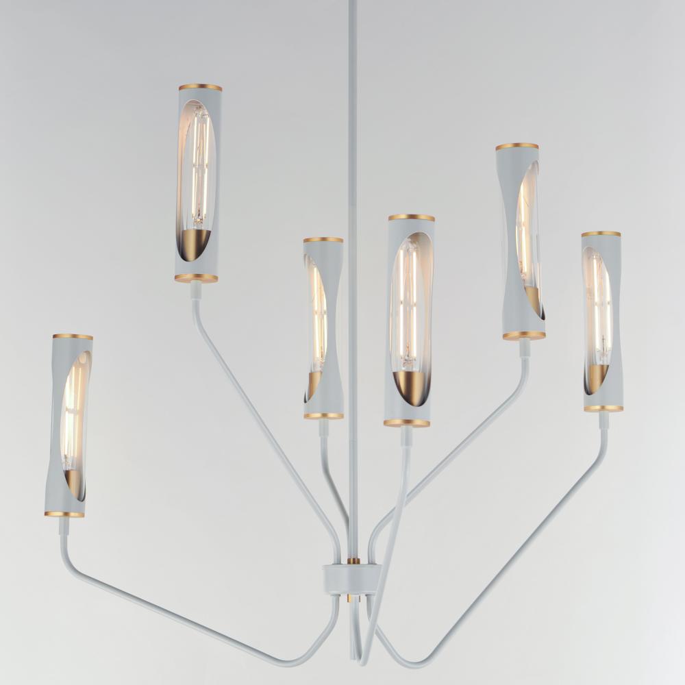 Glamourous and modern, this two-toned lighting collection plays with form and scale. A layered composition of materials, tubular lamps are protected within glass tubes sheathed in metal shades with oval cut-outs that reveal the light source. Chandelier Arm