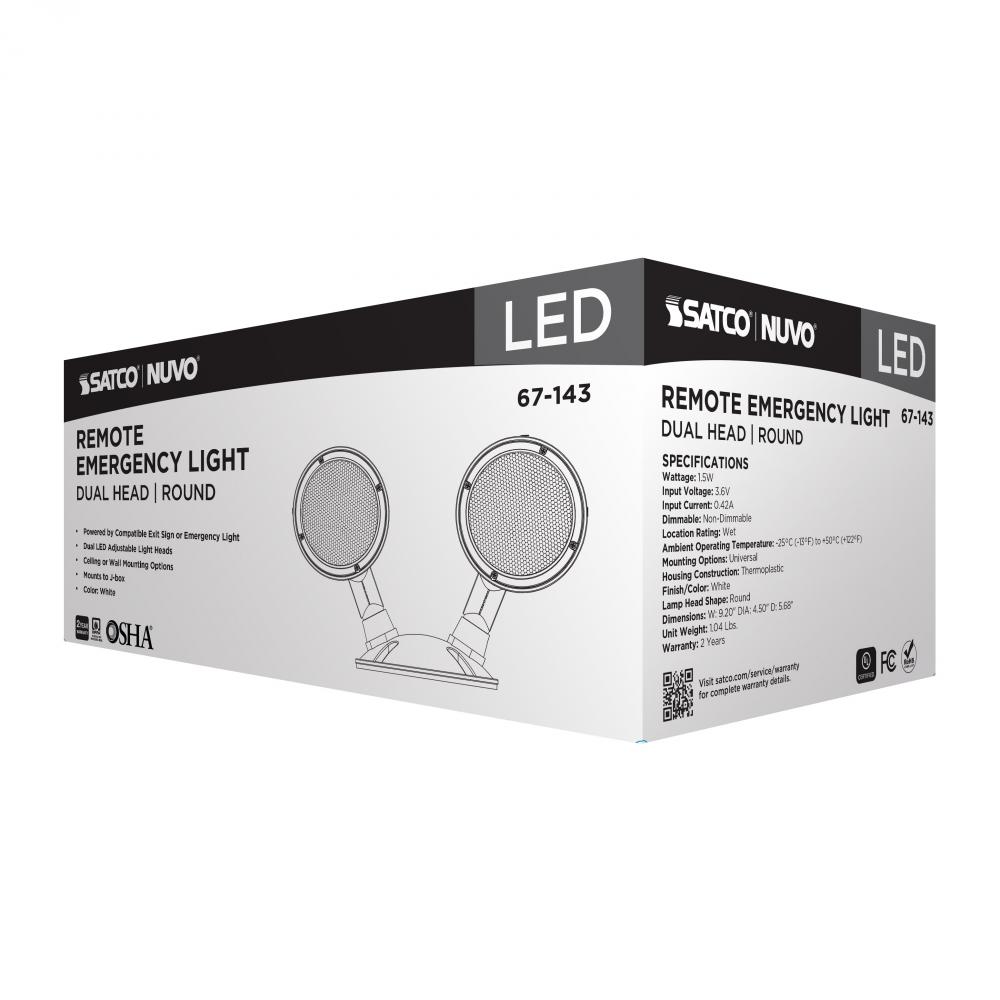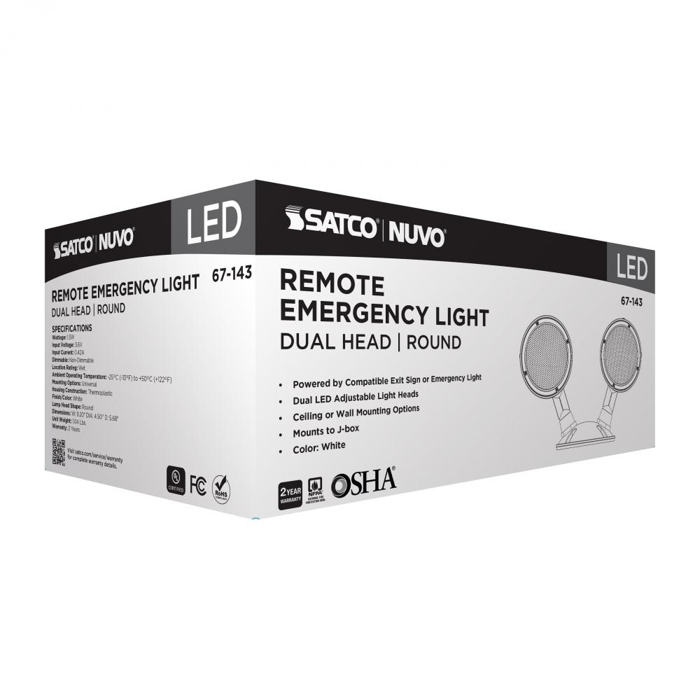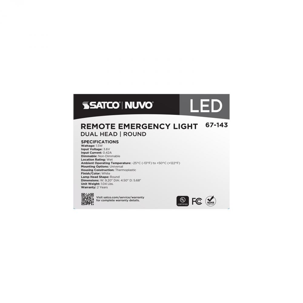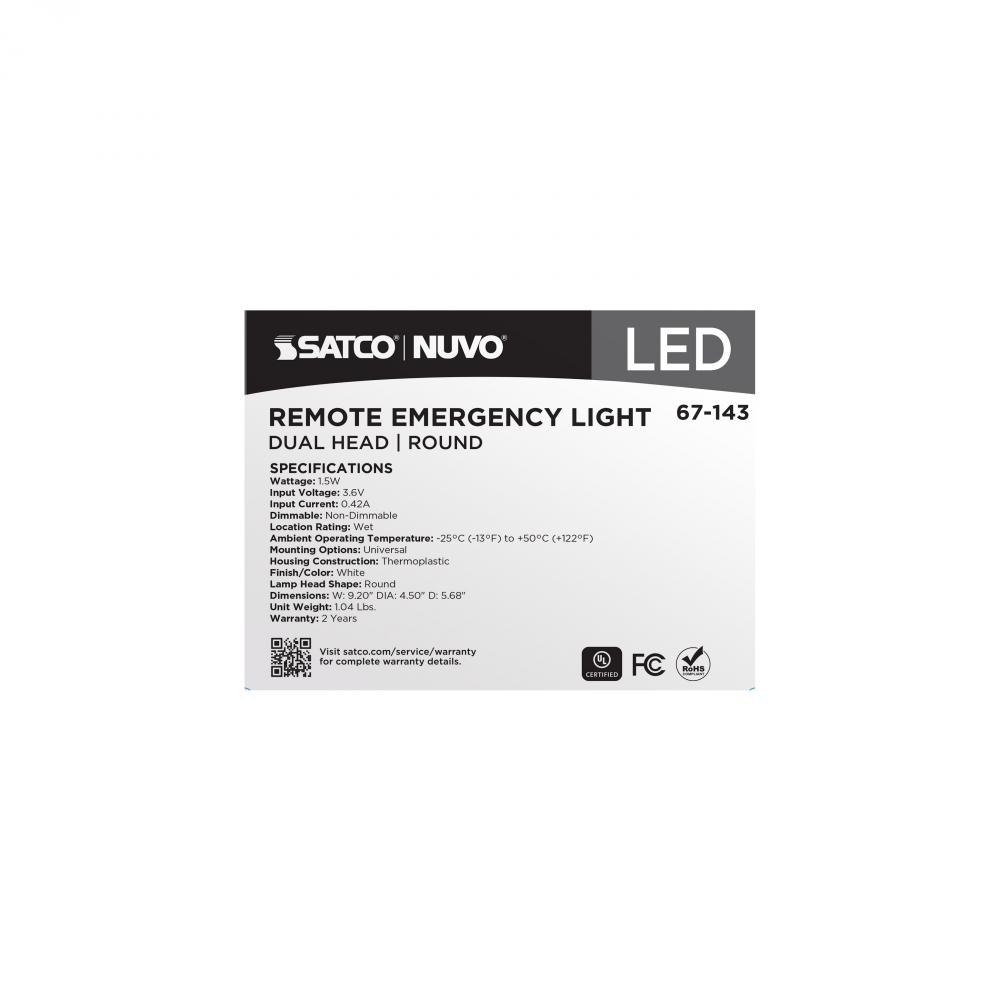 SATCO NUVO's 67-143 Remote Capable Emergency Lights allow for the addition of two single or one double remote head. Constructed from a 5VA flame-retardant ABS housing, these lights are built to withstand emergency situations. All models and remote head