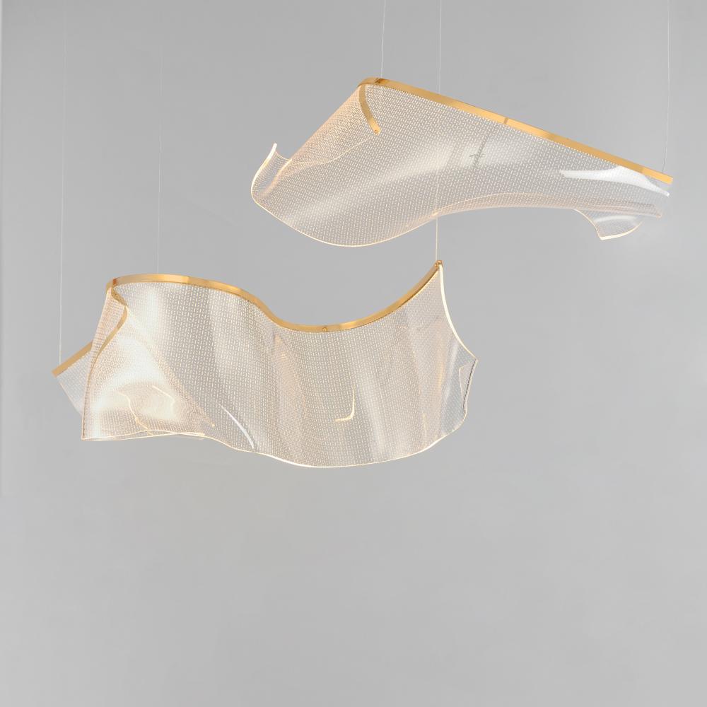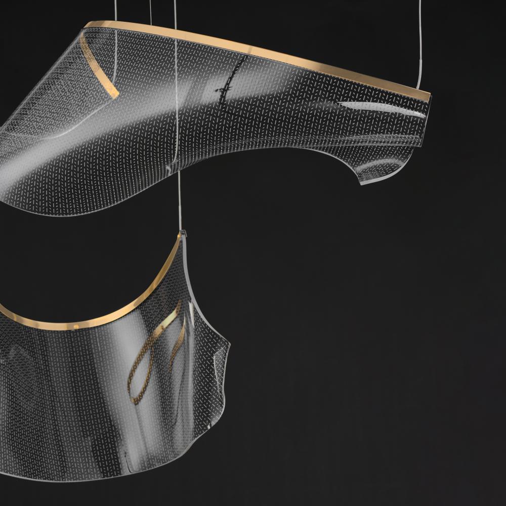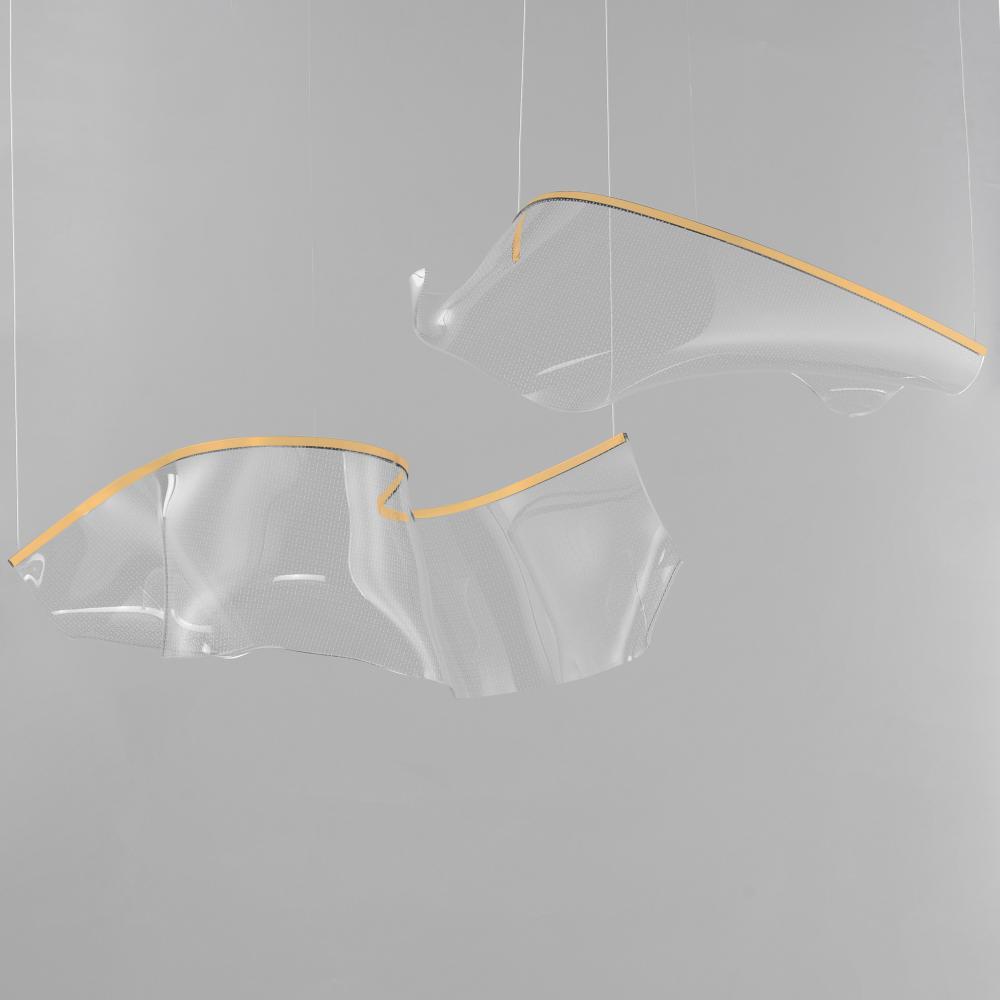 An airy arrangement of abstract forms, the Rinkle pendants feature sheets of transparent acrylic shaped by hand. The light guided acrylic captures the glow of energy efficient LEDs recessed within strips of shining stainless steel, obscuring the source of