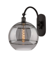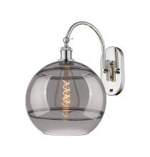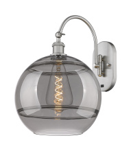 the arm swivels side to side at the base and the solid brass 180 degree adjustable swivel at the top of the socket has internal teeth that lock in at 5 degree intervals and allows for up and down tilting of the shade