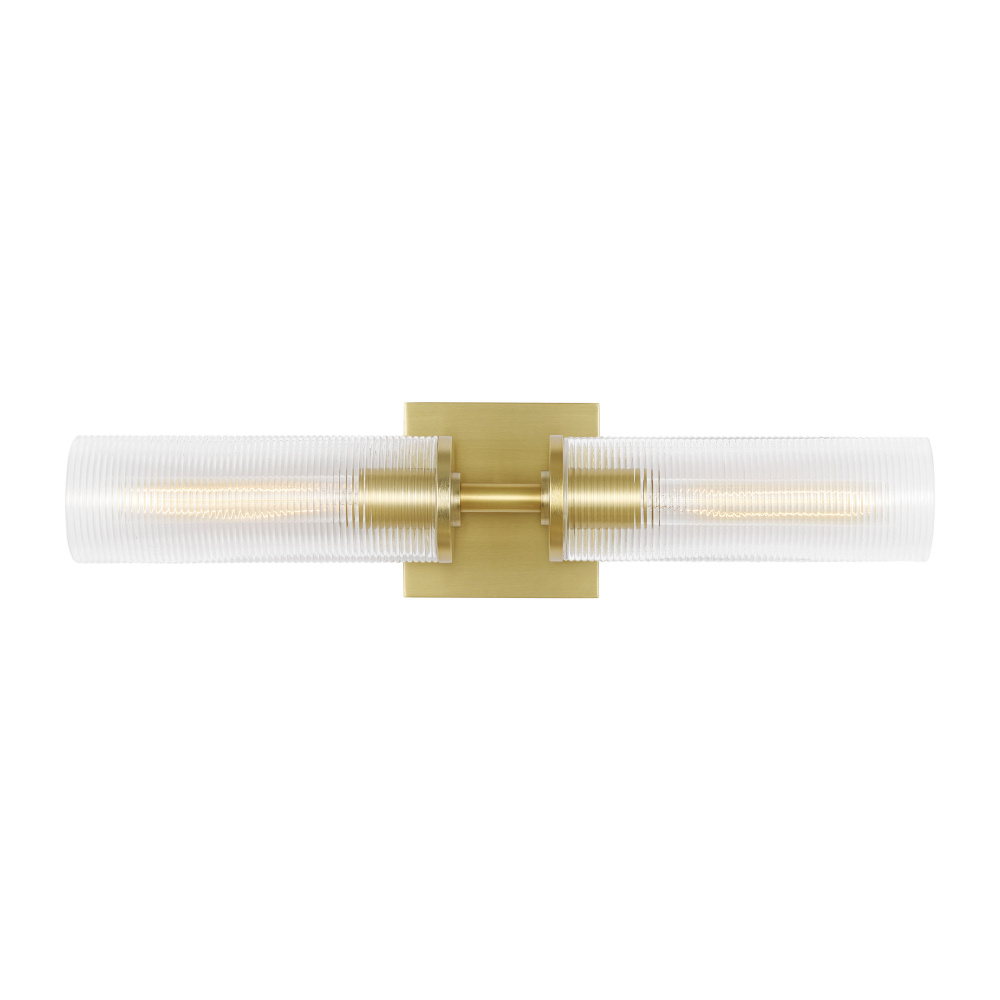 Crafted with Steel in a Satin Brass finish with clear ribbed glass shades