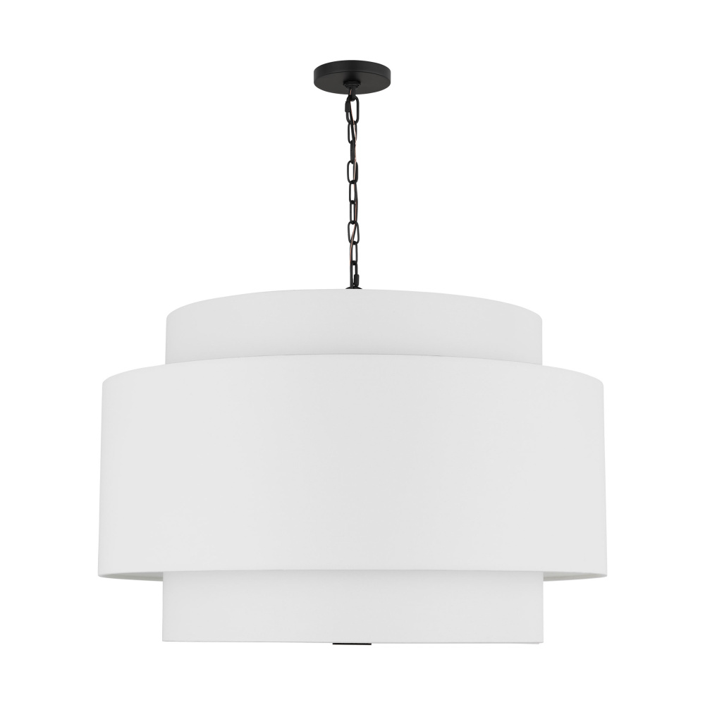 Inspired by kate spade new york whimsical geometry and playful lines, Sawyer has a striking silhouette with graphically taped shades. The Sawyer is a wide playful hanging shade with arched lines and wide, graphically taped shades. This simple and graphic chandelier would be great over a dining table or nook, as well as in a living room scenario.