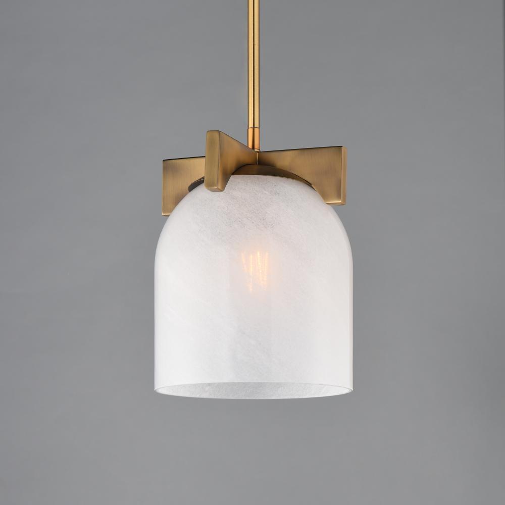 Cut-out metalwork curves around modern bell-shaped glass shades. The series includes pendants and bath vanities available in either Clear or a swirling Marble glass. Available in various complementary finishes: Polished Chrome, Matte Black, or Natural Aged