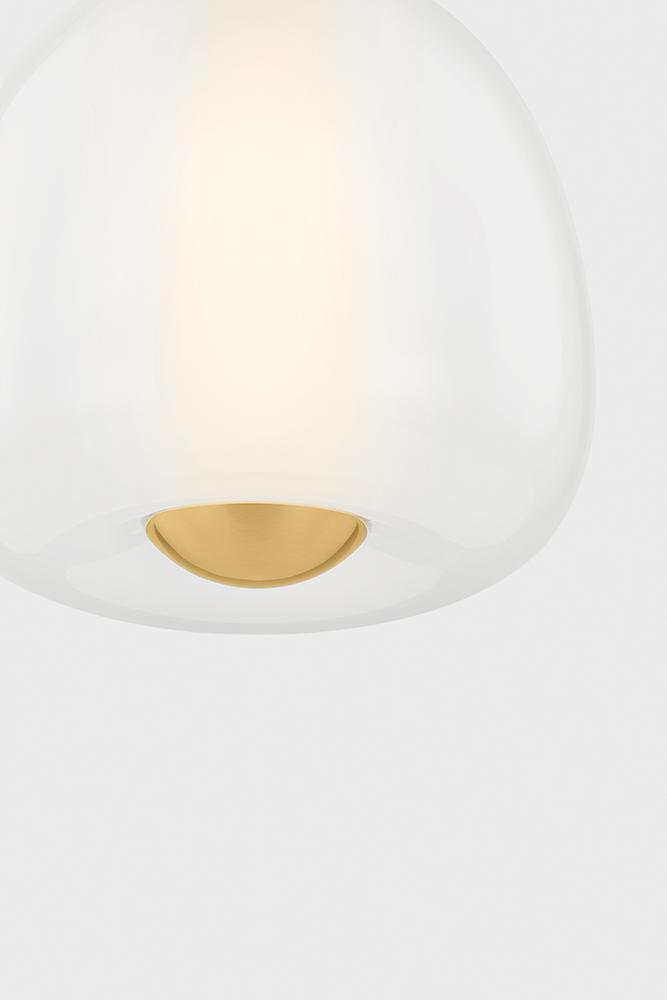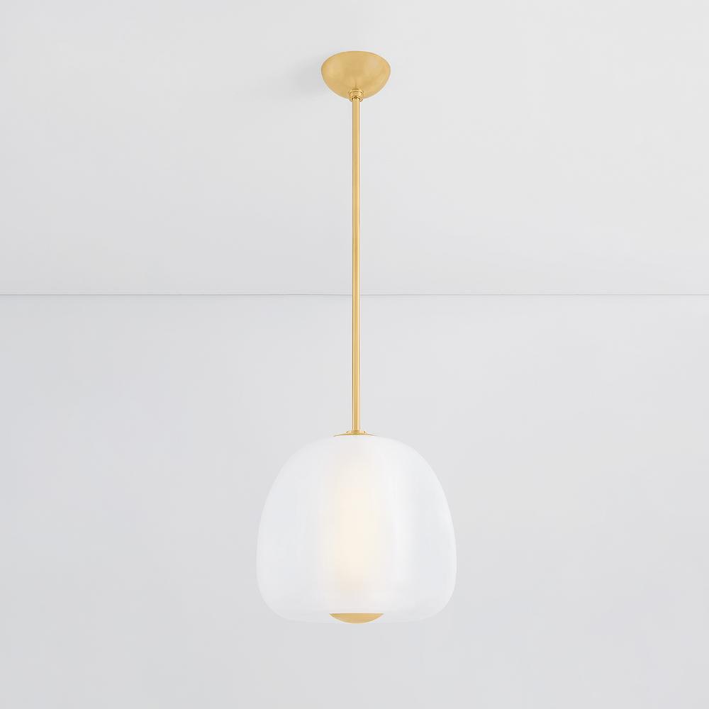 Inspired by the shape of an apple, Scranton features a softly defined outer layer of etched glass and a narrow ‘core’ of shiny opal glass within. The freshness of the organic silhouette, paired with the sleek glass layers and metal accents, makes it perfect for a dining room or kitchen. Scranton is available in two sizes and two finishes, Aged Brass and Old Bronze.