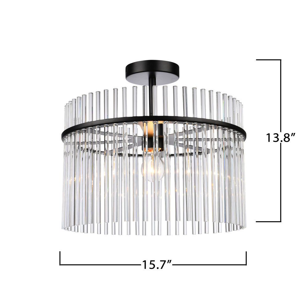 The Ava Collection pendant captivates with its refined allure, featuring glimmering circular glass rods gracefully suspended on a sleek black frame. Its versatile design allows it to shine as either a pendant or a semi-flushmount fixture, adapting effortlessly to your space. With its modern yet romantic aesthetic, it casts a soft, enchanting glow, elevating any room it adorns.