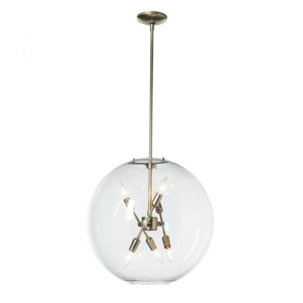Reminiscent of fireflies caught in a jar, a core of six candelabra lights fills an impressively scaled clear glass globe defining the Sfera 6-Light Pendant. Available in all standard finishes, this arresting ceiling fixture is suspended by a multi-stem rod system that extends to a discretely small, circular canopy.