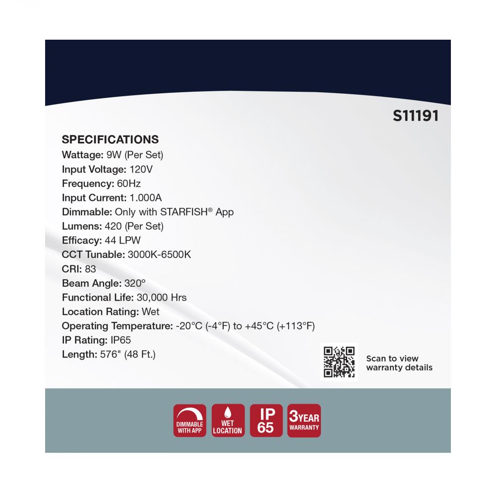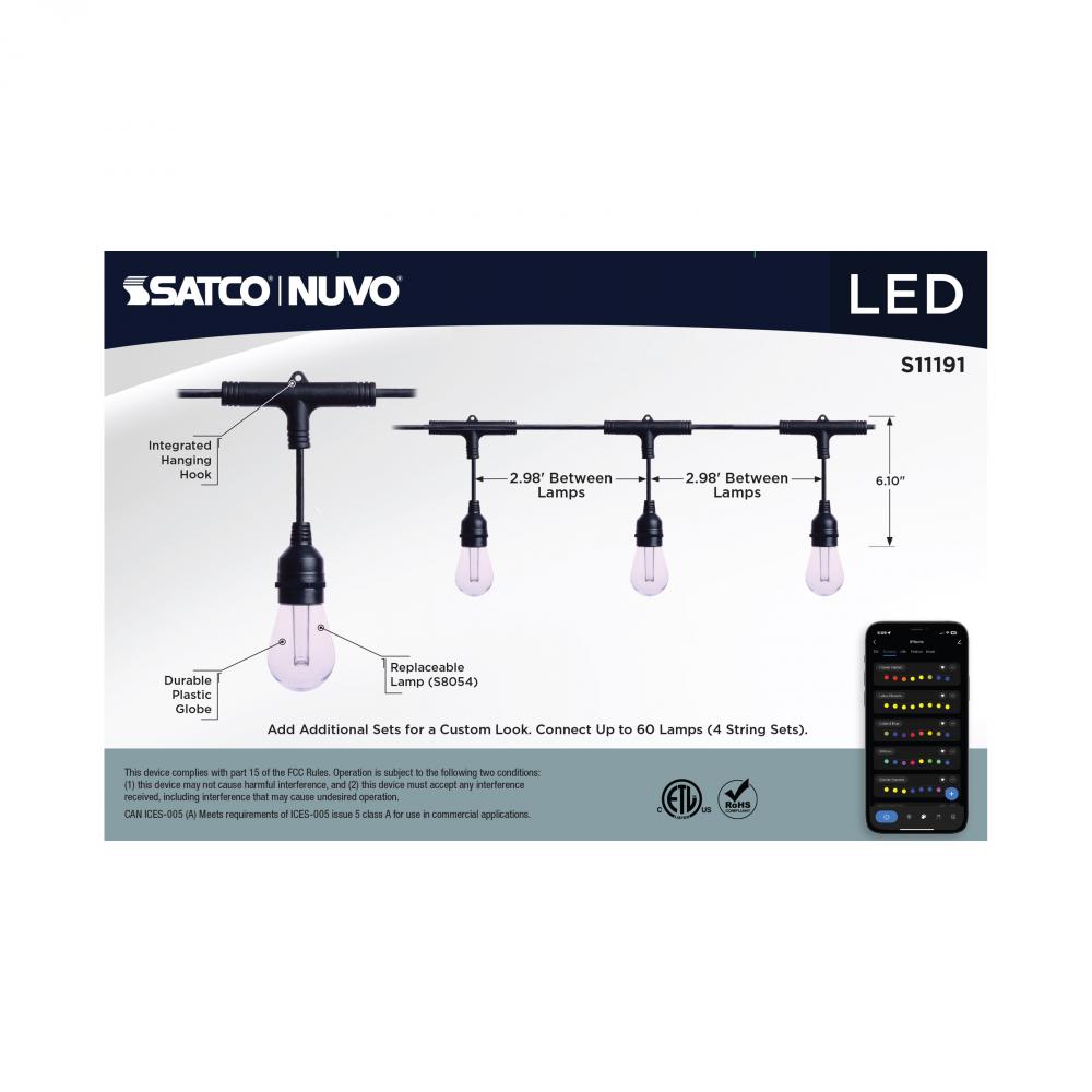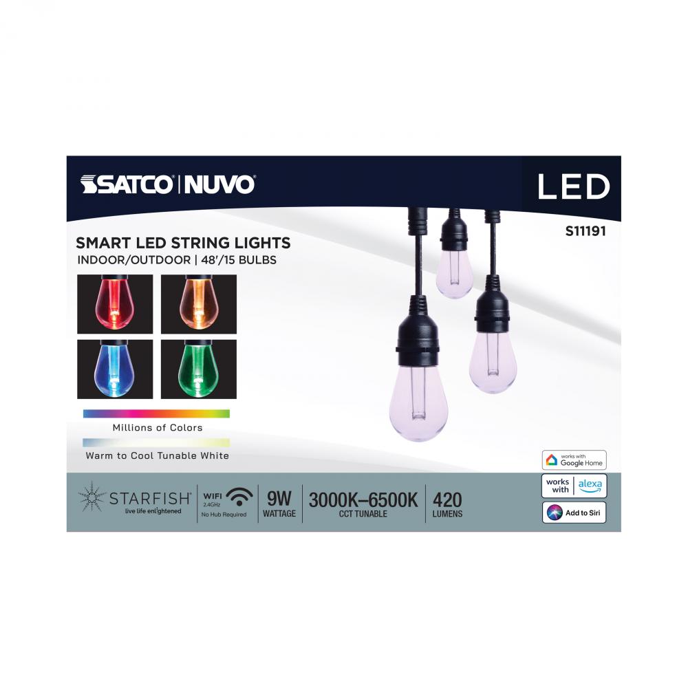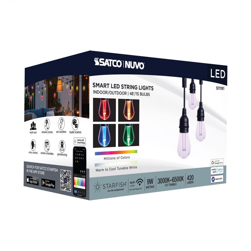 SATCO's STARFISH Smart LED String Lights deliver virtually unlimited color selections and control with the STARFISH app. Easily install with the integrated hanging hooks, connect to the app, and tailor the ambiance of your patio, dining area, or party