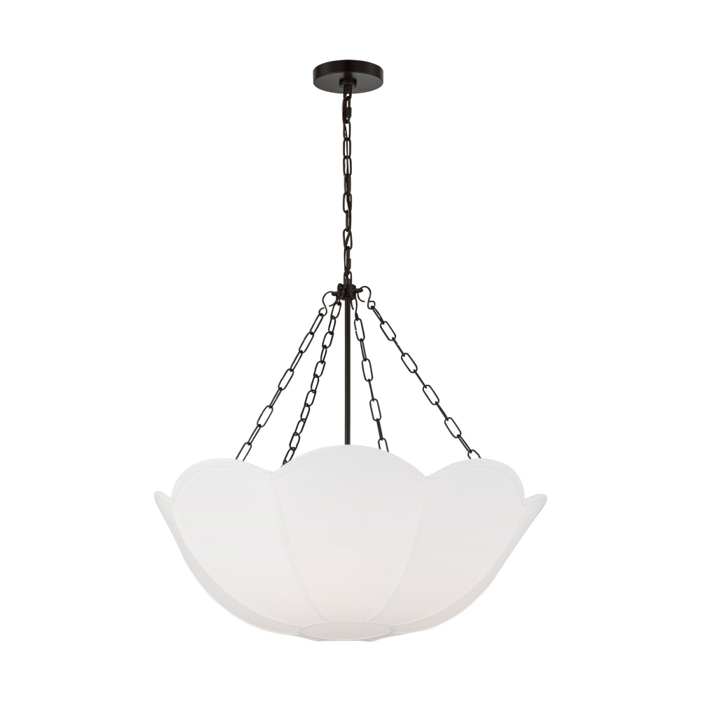 Reminiscent of a spring tulip, the Stassi series by Alexa Hampton updates Art Nouveau inspiration with a modern aesthetic. The scalloped basket silhouette is completed by the contrast of metal chain and white linen. The chandelier will create a harmonious statement hanging in a living room, dining room or bedroom.
