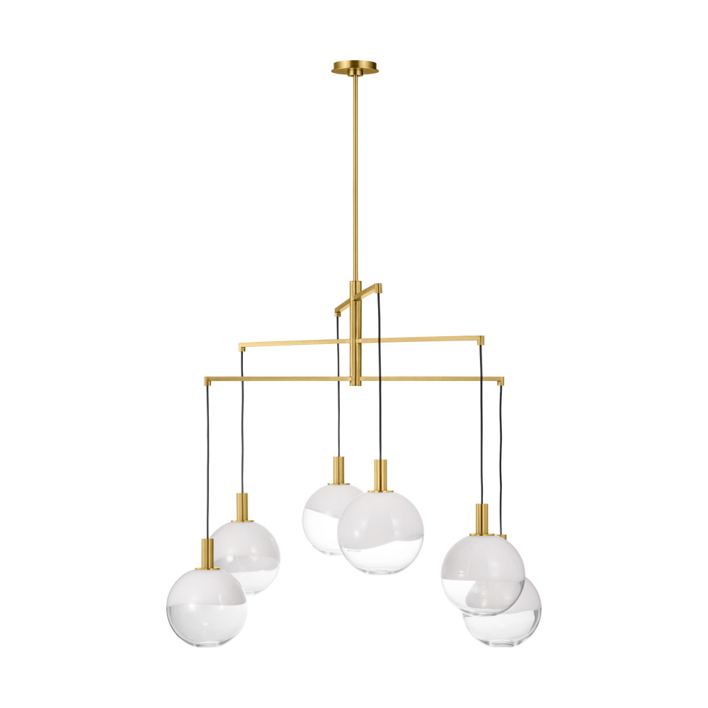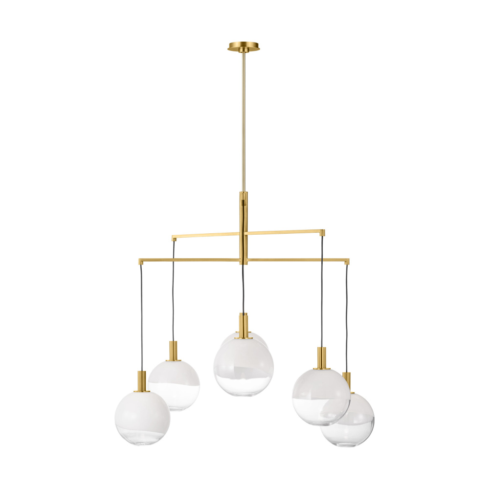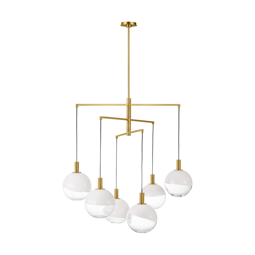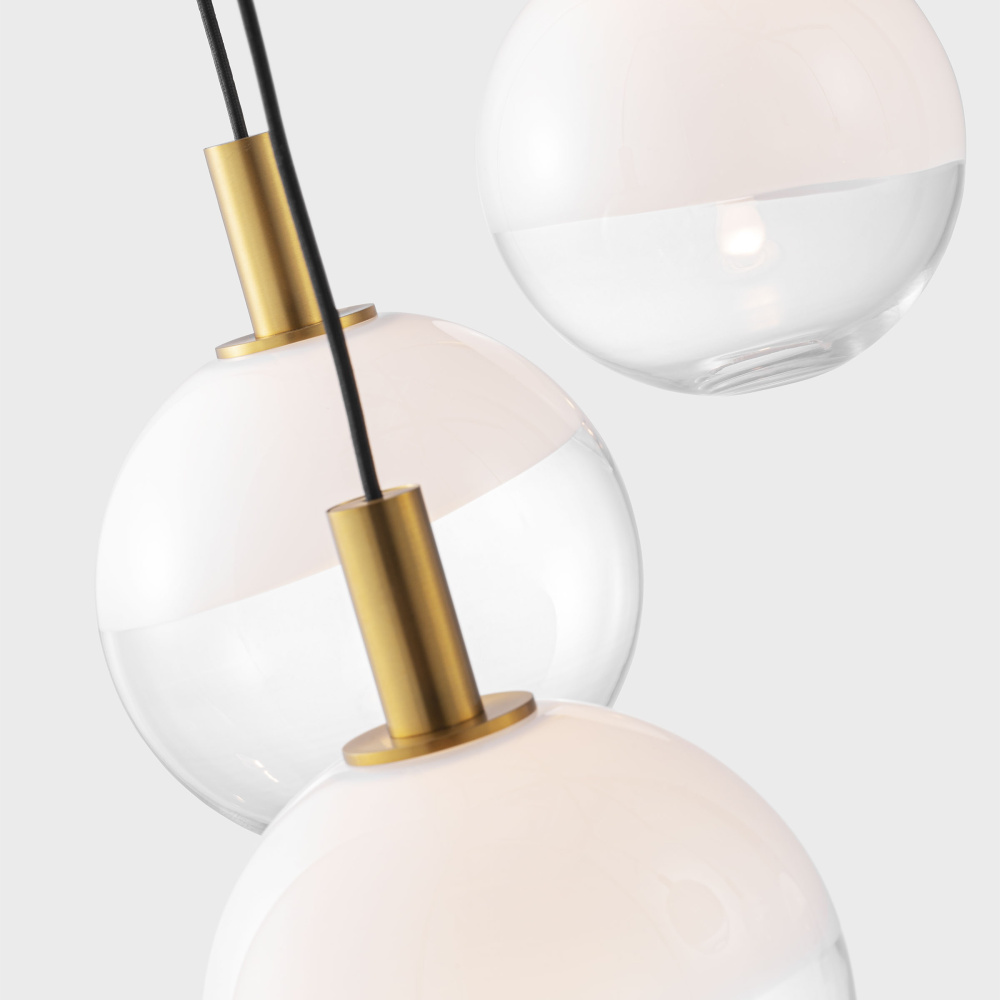 The Torian collection by Sean Lavin draws inspiration from sculptural hanging mobiles. Multiple arms with fabric cords suspend beautiful glass globe shades with an ombre effect, transitioning from milk to etched clear glass. Ideal for entryways and dining rooms, the Torian chandelier will lend a sophisticated artistic touch to interior spaces.