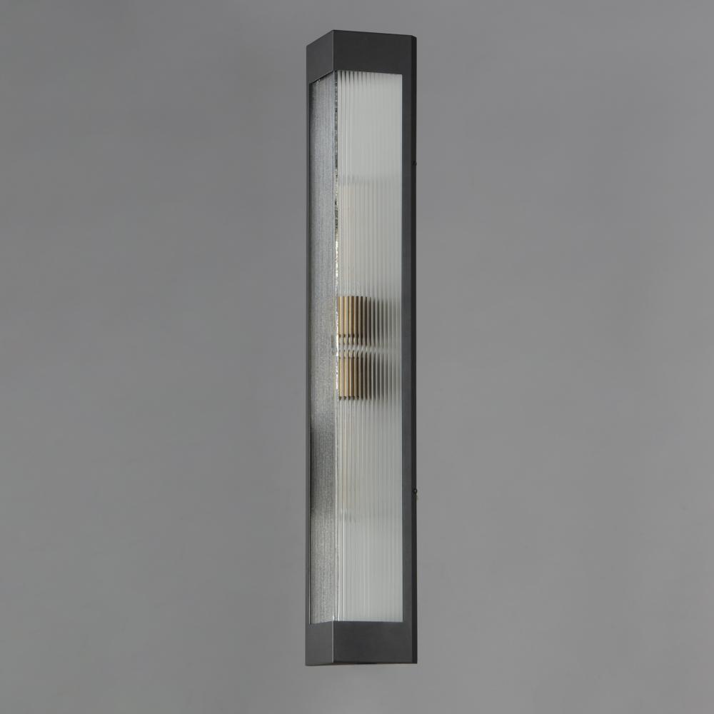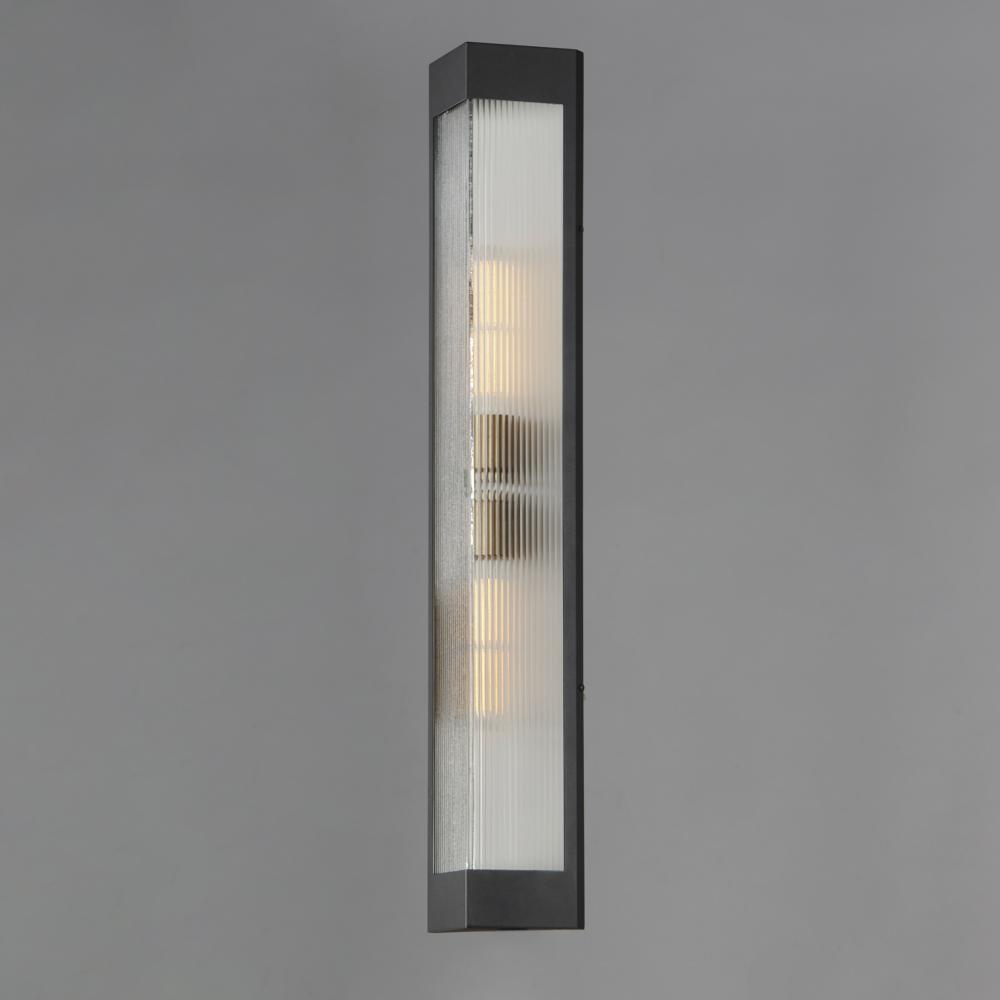 A transitional design suitable for both modern and more traditional applications, this outdoor series of lighting features Clear Ribbed glass that refracts the light source within triangular frames. A Black frame with warm Antique Brass light clusters with