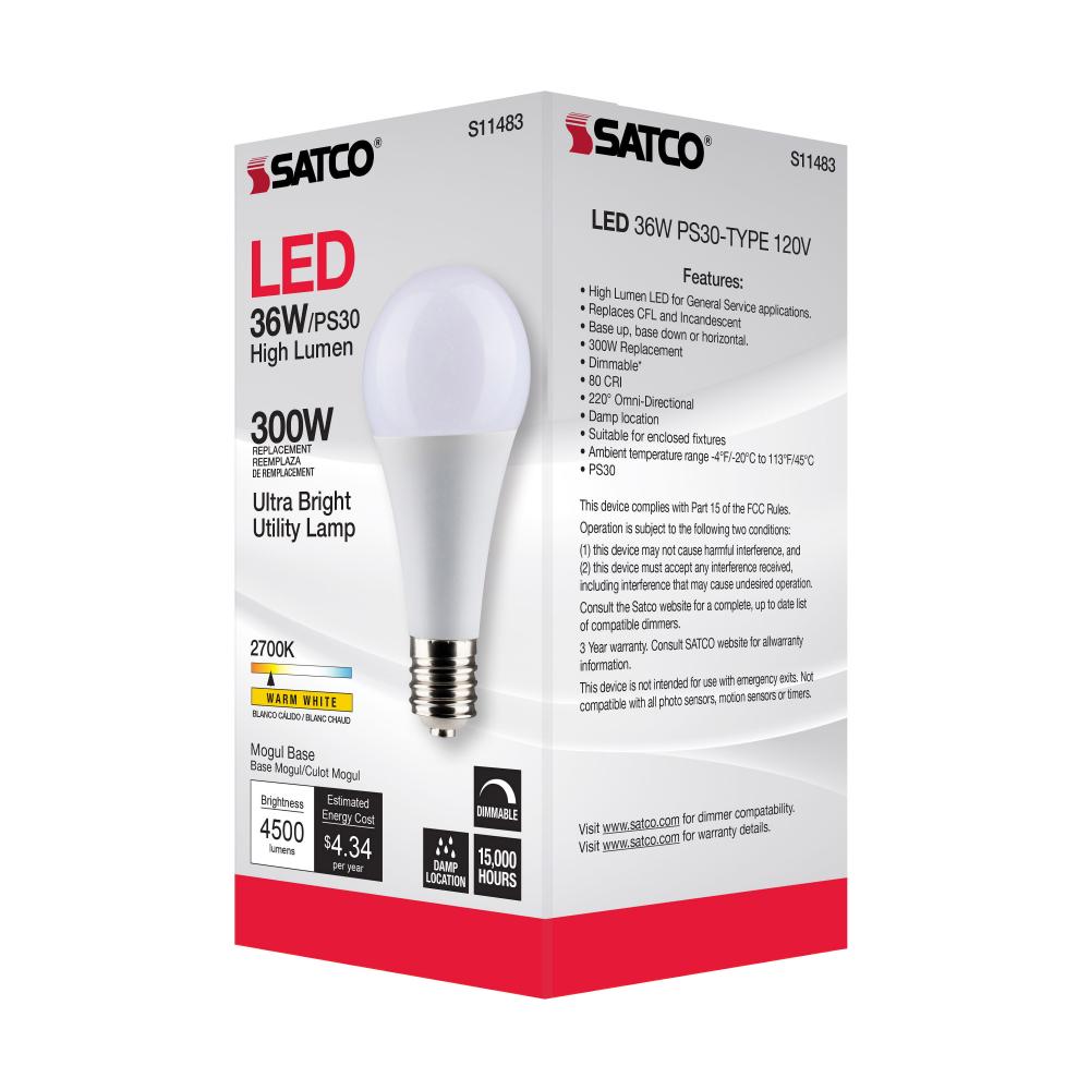 Ultra Bright Utility Lamp; 36 Watt; PS30 LED; Dimmable; White Finish; Mogul Base; 2700K; 120 Volt; High Lumen